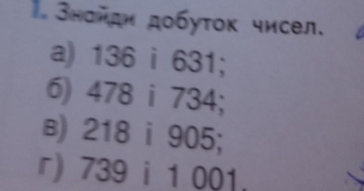 1. Знайди добуток чисел. a) 136 i 631; 478 i 734; 6) B) 218 i 905; г) 739 і 1 001.в стовпчик срочно нужен ответ!!!!!!!!!!!!!!!