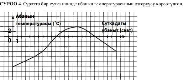 СУРОО 4. Сүрөттө бир сутка ичинде абанын температурасынын өзгөрүүсү көрсөтүлген. Абанын температурасы (C) 2 0 1 Суткадагы убакыт (саат)