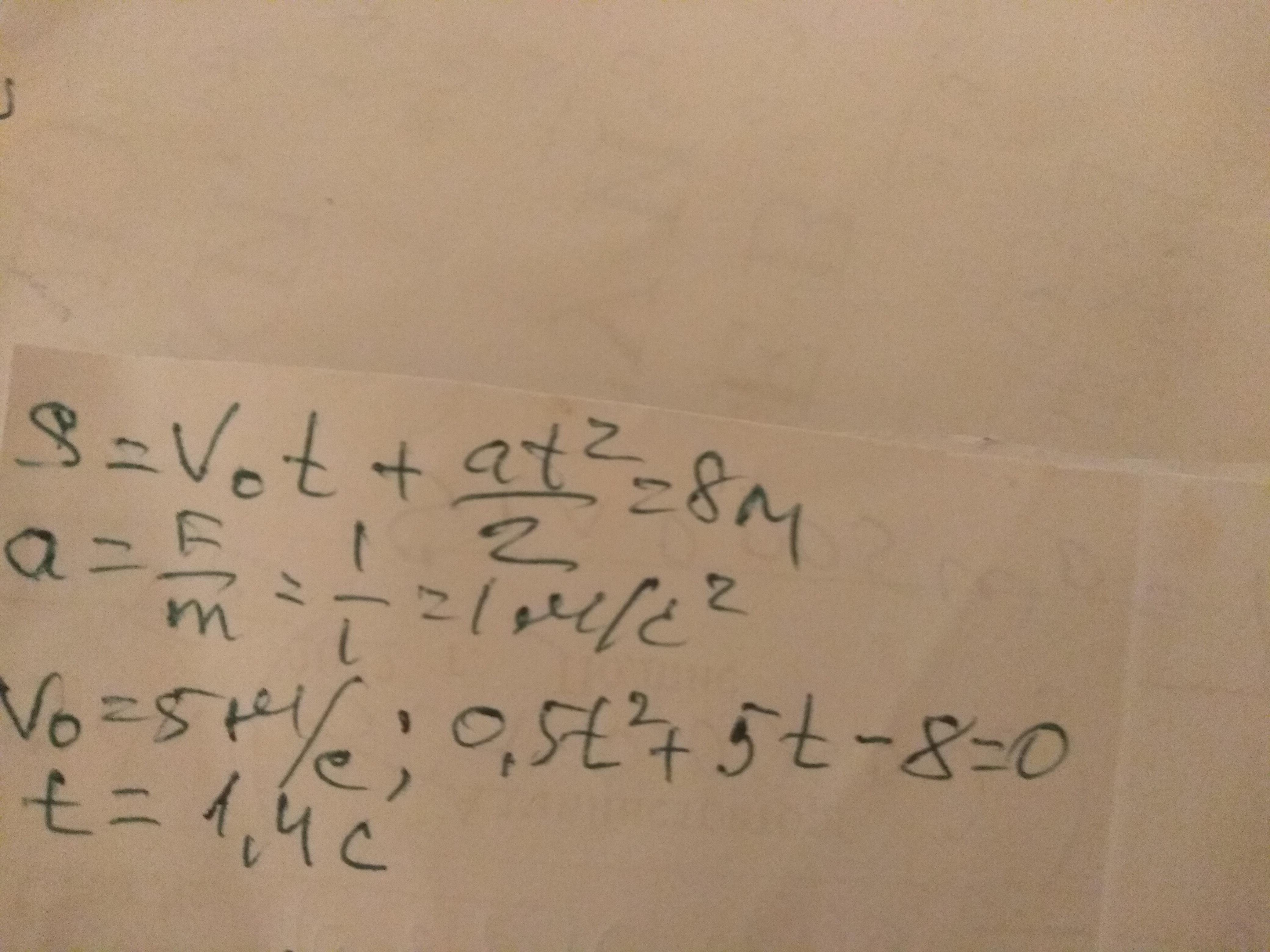 тело массой 1 кг двигалось со скоростью 5 М/с, когда на него в там направлении движения начала действовать сила 1 Ньютон. За какое время тело пройдет путь в 8 м после этого? решите плииз