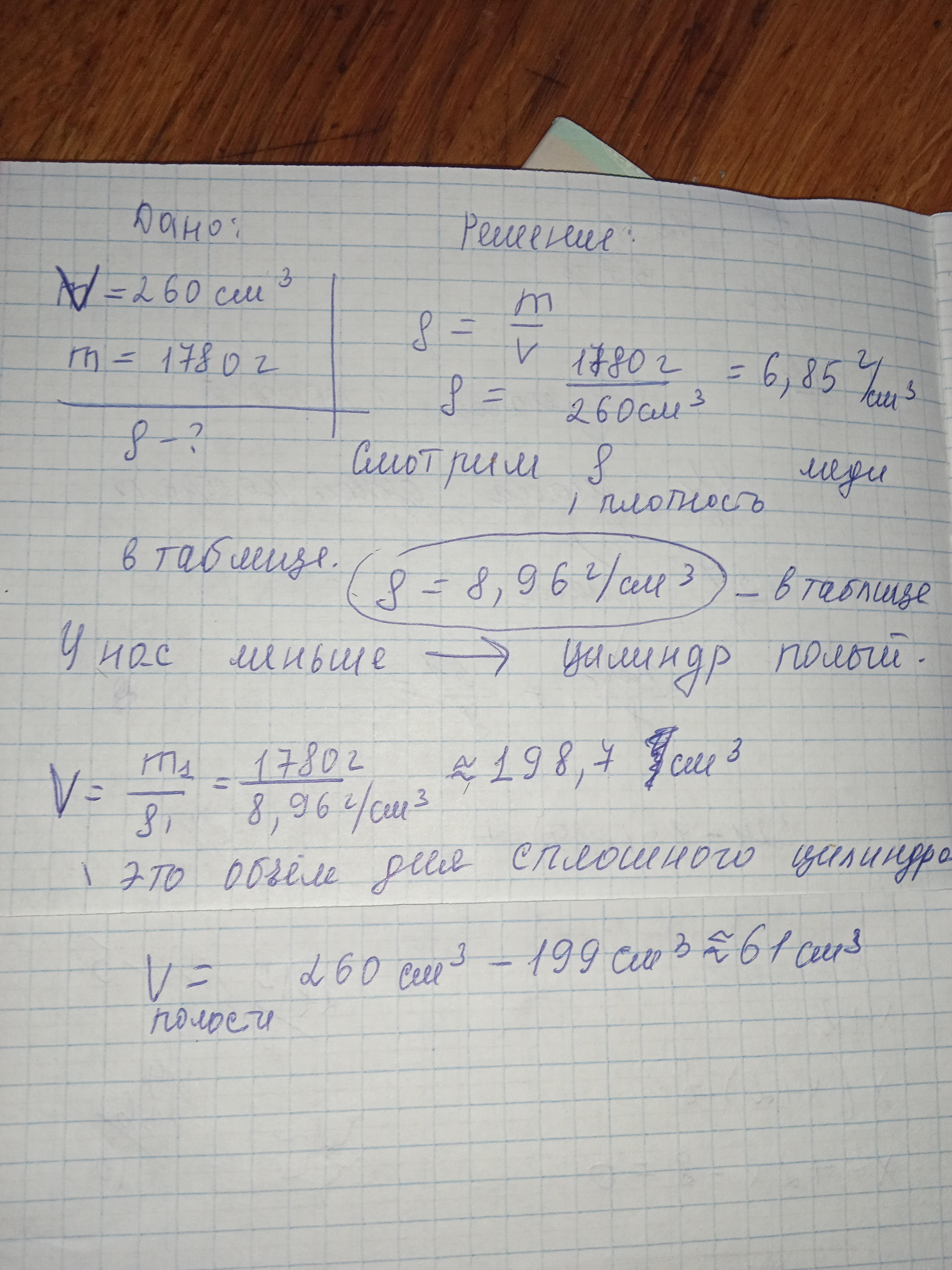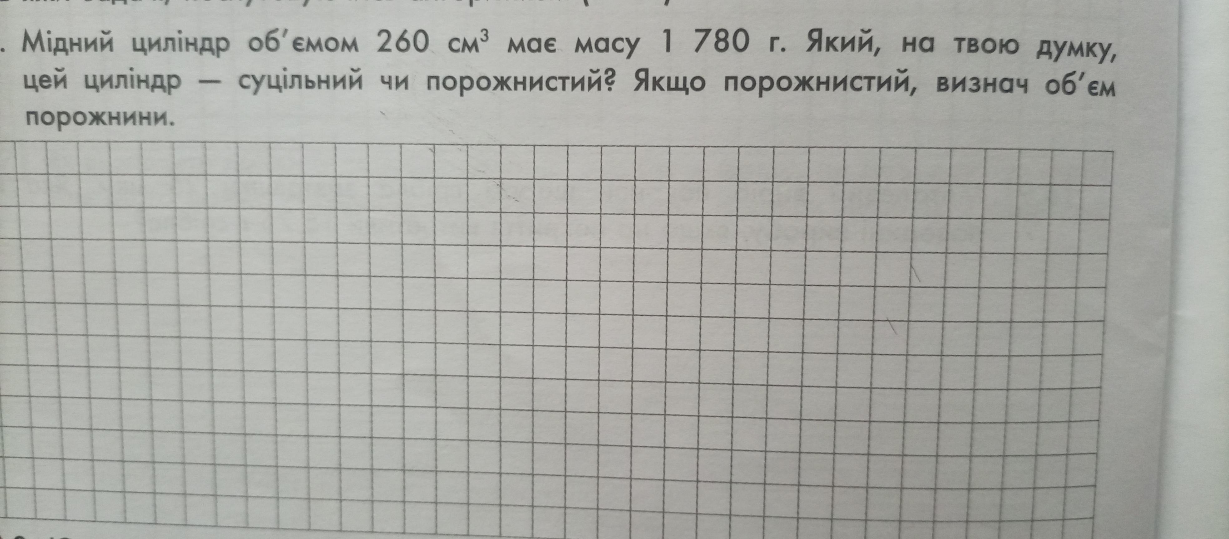 Мідний циліндр об'ємом 260 см3 має масу 1 780 г. Який, на твою думку,