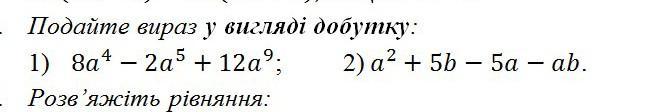 4. Подайте вираз у вигляді добутку: 1) 8a4 - 2a5 + 12а9; 2) a² + 5b - 5a - ab.