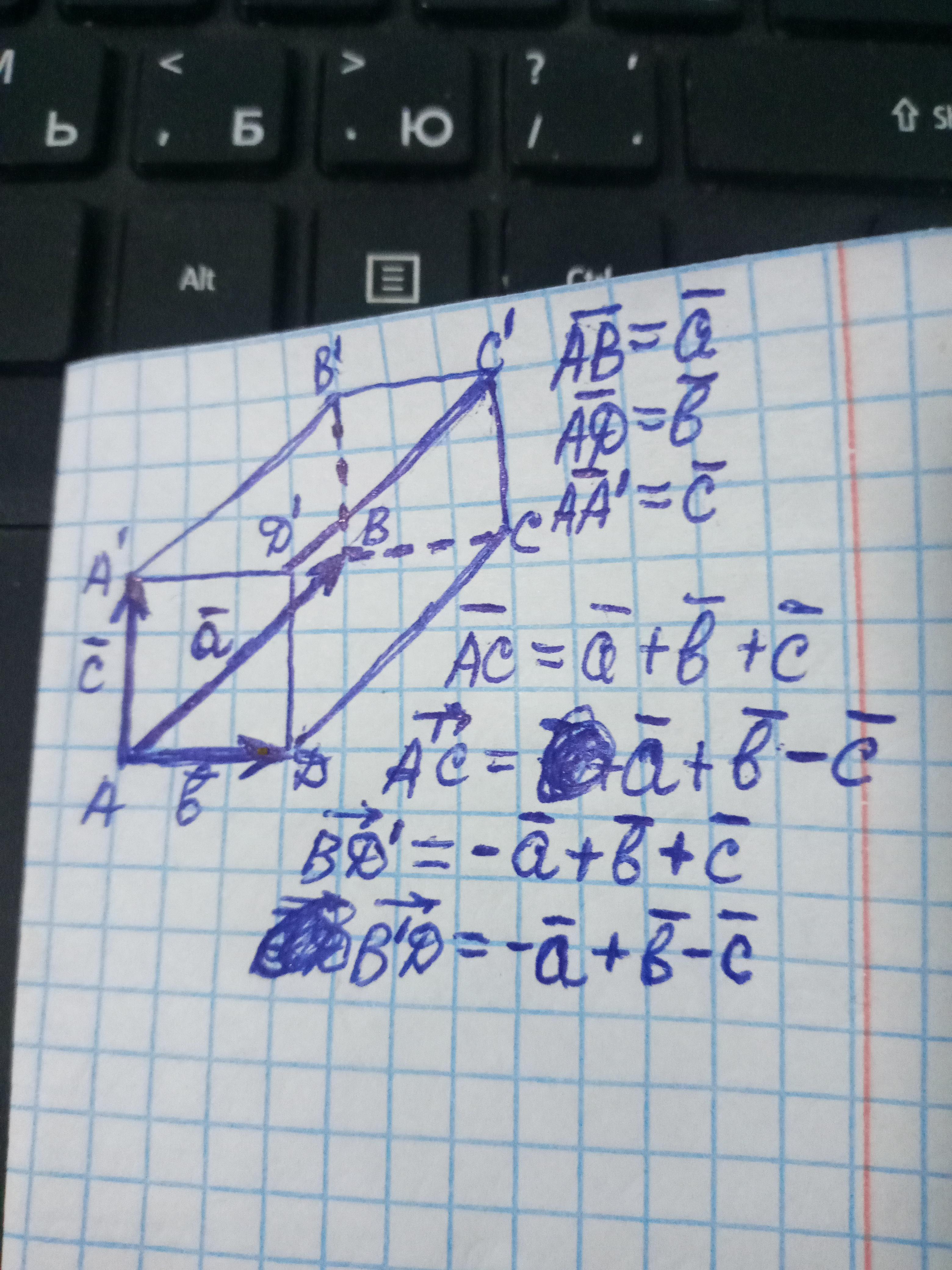 В параллелепипеде ABCDA'B'C'D' представлены векторы AB=a AD= b и AA=c, совпадающие с его ребрами. Найти векторы – диагонали AC', A'C, BD', B'D.