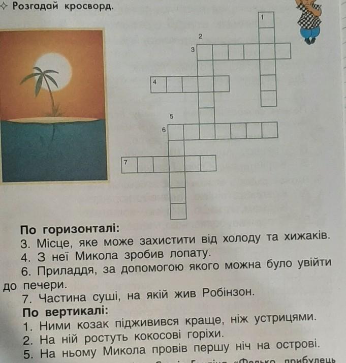 Розгадай кросворд. 4 6 5 3 2 По горизонталі: 3. Місце, яке може захистити від холоду та хижаків. 4. З неї Микола зробив лопату. 6. Приладдя, за допомогою якого можна було увійти до печери. 7. Частина суші, на якій жив Робінзон. По вертикалі: 1. Ними козак підживився краще, ніж устрицями. 2. На ній ростуть кокосові горіхи. 5. На ньому Микола провів першу ніч на острові. алько прибулець