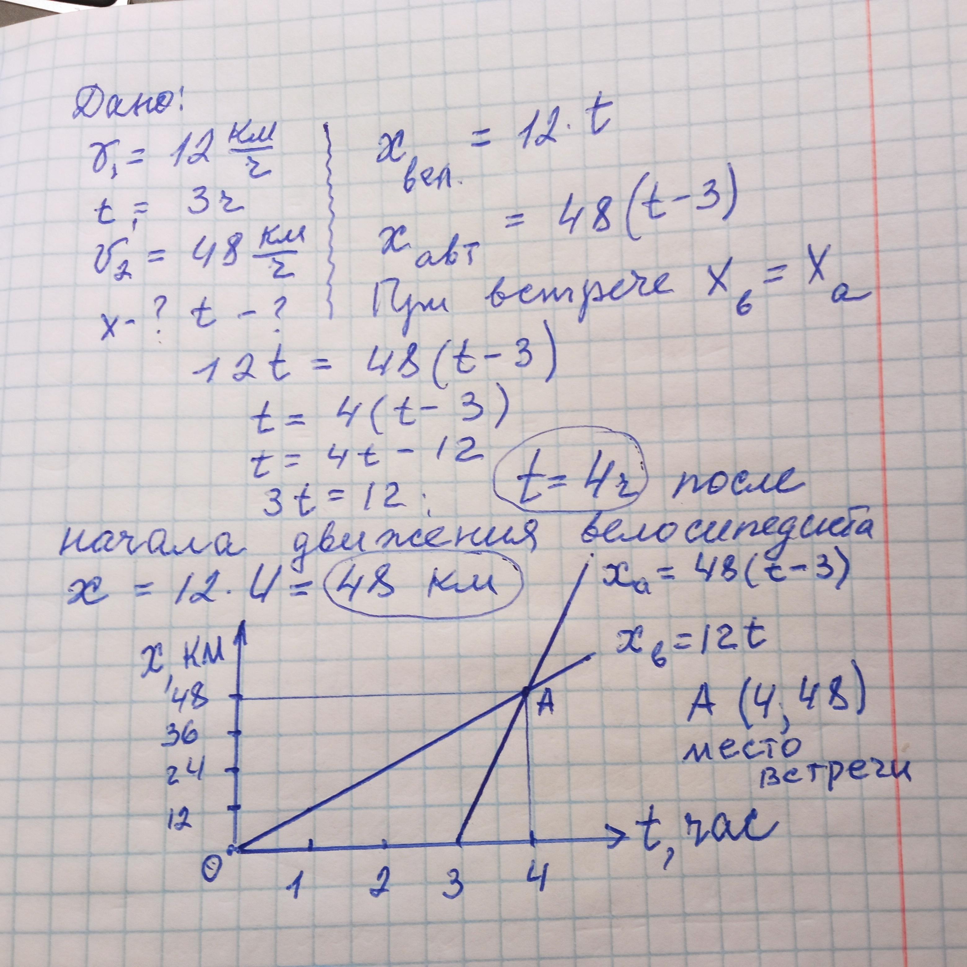 Із міста виїхав велосипедист зі швидкістю 12км/год.Слідом за ним через 3 години виїхав автомобіль зі швидкістю 48км/год.через який час і на якій відстоні авто. наздожене велосипедиста? Побудуйте графіки залежності шляху, пройденого велосипедистом і автомобідем, від час їхнього руху. Копистуючись гиафіками, визначте, те, через який час і на якіц відстані від міста автомобіл