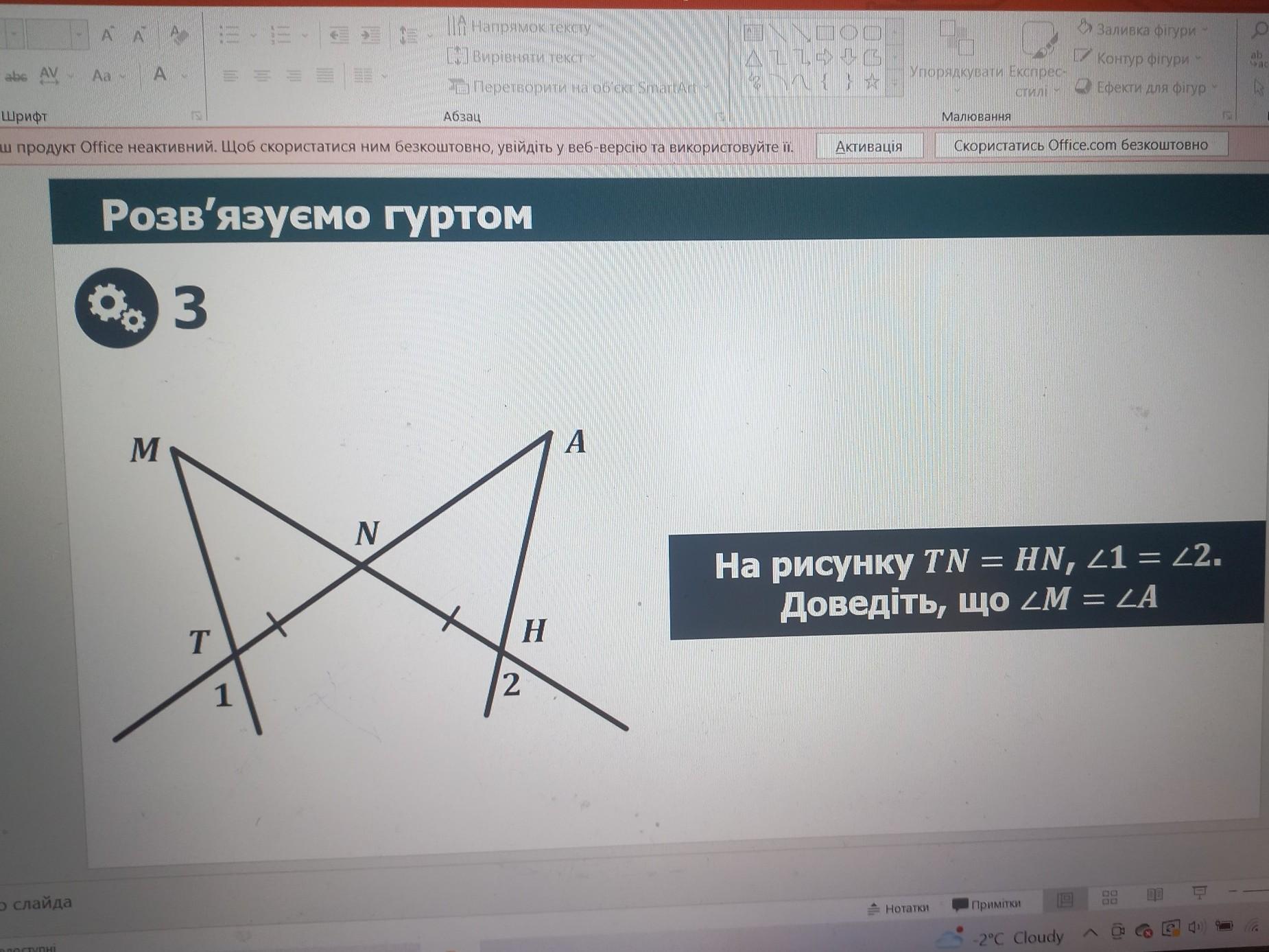 4)За ознакою трикутників проти рівних сторін лежать рівні кути. Сторона TN дорівнює NH , значить кут M дорівнює куту A.