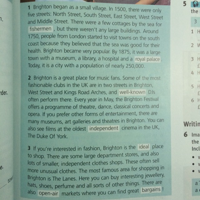 Брайтон начинался как маленькая деревушка. В 1500 году там было только 5 улиц, Северная улица, Южная, восточная, западная улица и центральная улица. Там было несколько хижин у моря для рыбаков, но не было больших зданий. Около 1750 года, народ из Лондона начал посещать города на южном побережье, потому что они верили что море это хорошо для их здоровья. Брайтон стал очень популярным. С 1875 года это был большой город с музеем, библиотекой, больницей и королевским дворцом. Сегодня это город с населением около 250000.