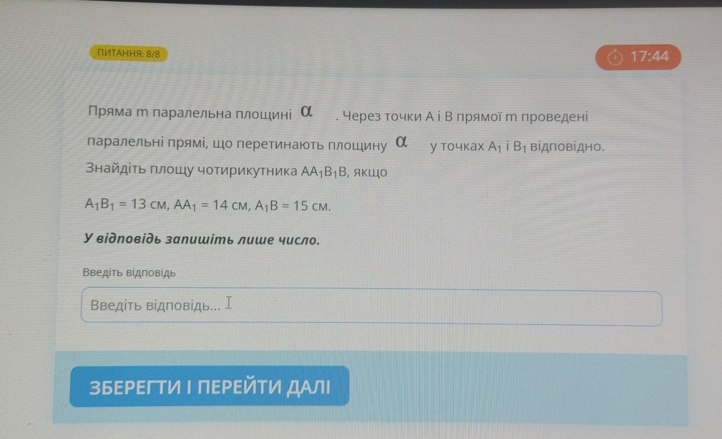ПИТАННЯ: 8/8 Пряма м паралельна площі а Через точки А і в прямої м проведені паралельні прямі, що перетинають площину a у точках А1 і В1 відповідно. Знайдіть площу чотирикутника АА1В1В, якщо А1В1 = 13 см, AA1 = 14 см, A1B = 15 см. У відповідь запишіть лише число. Введіть відповідь Введіть відповідь... І