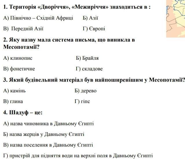 3.В (В Месопотамії не немає готових будівельних матеріалів таких як дерево і каміння)