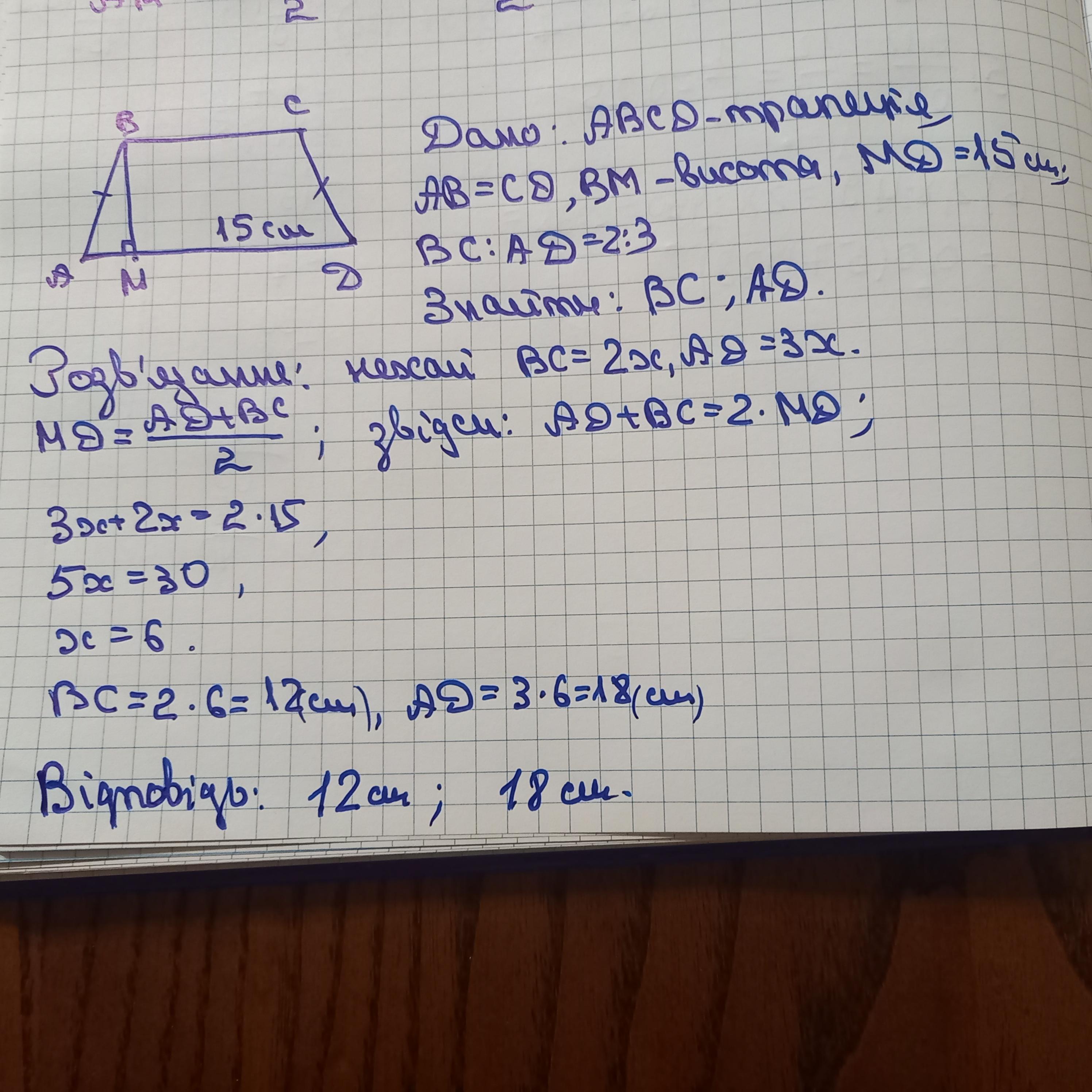 Відповідь: 12 см, 18 см Розв'язання завдання додаю