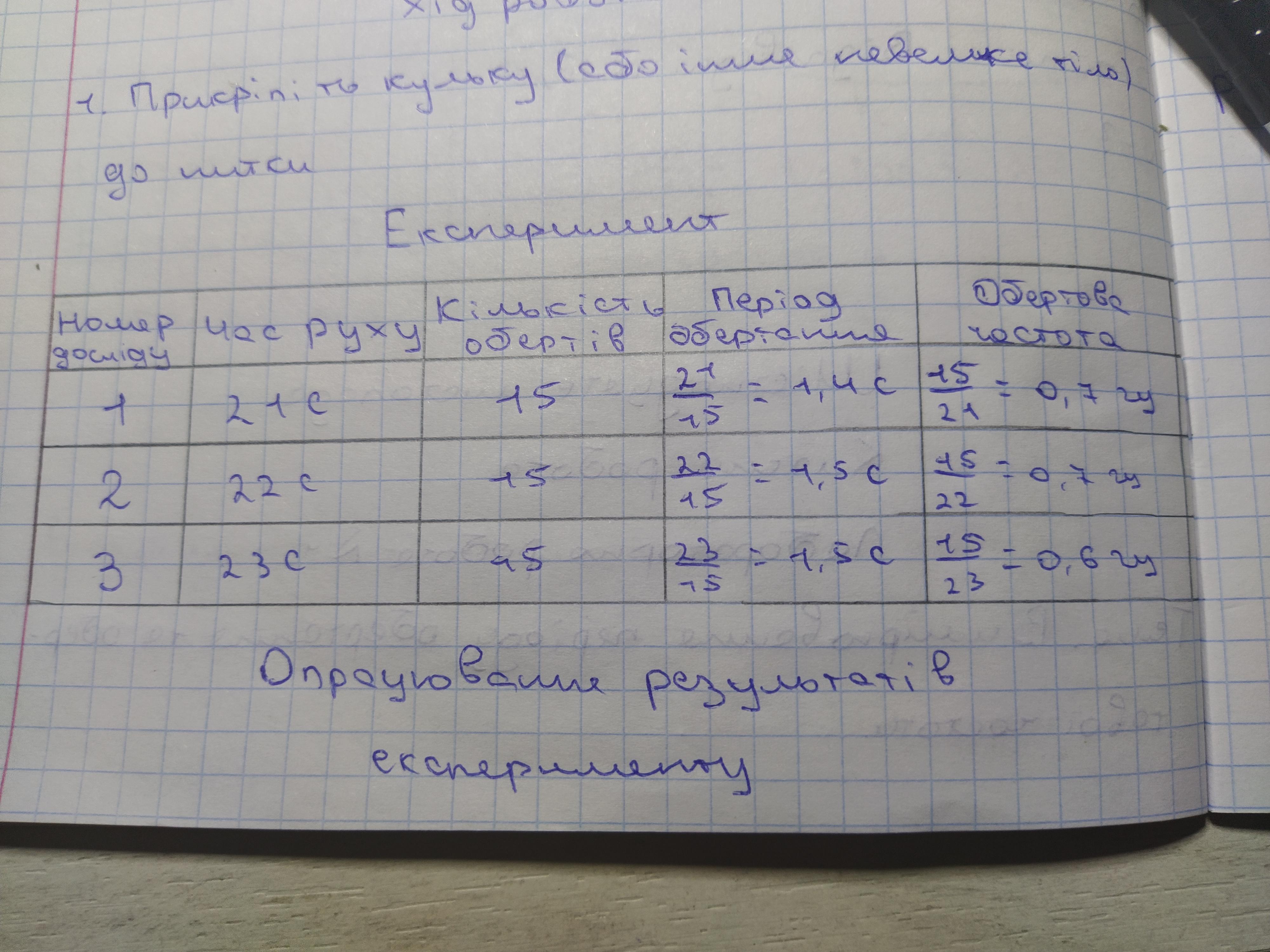 1. Візьміть за петлю нитку з тілом. Розташуйте руку над центром зображеного кола. Не змінюючи положення руки, примусьте тіло рухатися так, щоб траєкторія його руху збігалася з колом. Старайтесь не змінювати швидкість руху тіла в усіх дослідах. 2. Виміряйте час , за який здійснюється, наприклад, 10-15 обертів тіла.Дослід повторіть три рази.