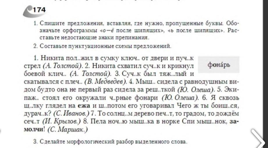 1. Никита положил (чередующийся корень -лаг-, -лож-) в сумку ключ (мужчкой род) от двери и пучок стрел (А. Толстой). 2. Никита схватил сучки (-чк-, -чн- без мягкого знака), крикнул боевой клич (А. Толстой). 3. Сучок был тяжёлый и скатывался с плеч (средний род, родительный падеж) (В. Медведев). 4. Мышь (женский род) сидела с равнодушным видом, будто она не первый раз сидела за решёткой (Ю. Олеша). 5. Экипаж (мужской род) стоял, его окружали чёрные фонари (Ю. Олеша). 6. Я сквозь щёлку глядел на ежа и шёпотом (шепчет) его уговаривал: "Чего ж ты боишься (глагол 2 спряжения), дурачок?" (С. Иванов.) 7. То солнцем дерево печёт (окончание ёт), то градом, то дождём сечёт (окончание ёт) (И. Крылов.) 8. Пела ночью (3 склонение) мышка в норке: "Спи, мышонок(обращение), замолчи!"(С. Маршак.)