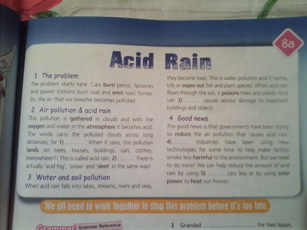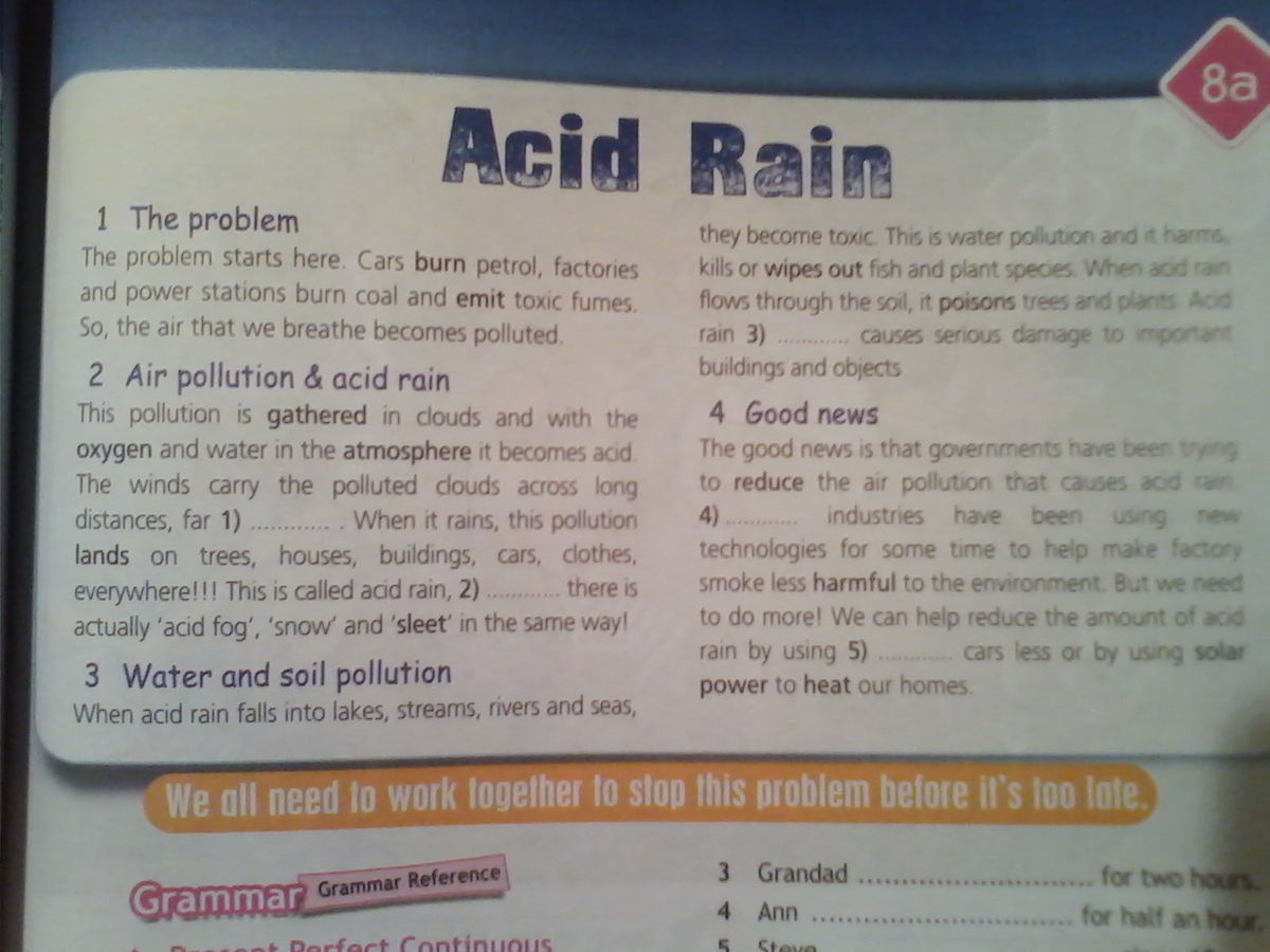 Хорошие новости в том, что правительства пытались уменьшить загрязнение воздуха, которое вызывает кислотные дожди. ........ промышленность использовала новые технологии на некоторое время, чтобы помочь сделать дым от заводов менее вредным для окружающей среды. Но нам нужно сделать больше! Мы можем помочь уменьшить количество кислотных дождей с помощью...... меньше автомобилей(?) или с помощью солнечной энергии для отопления наших домов.