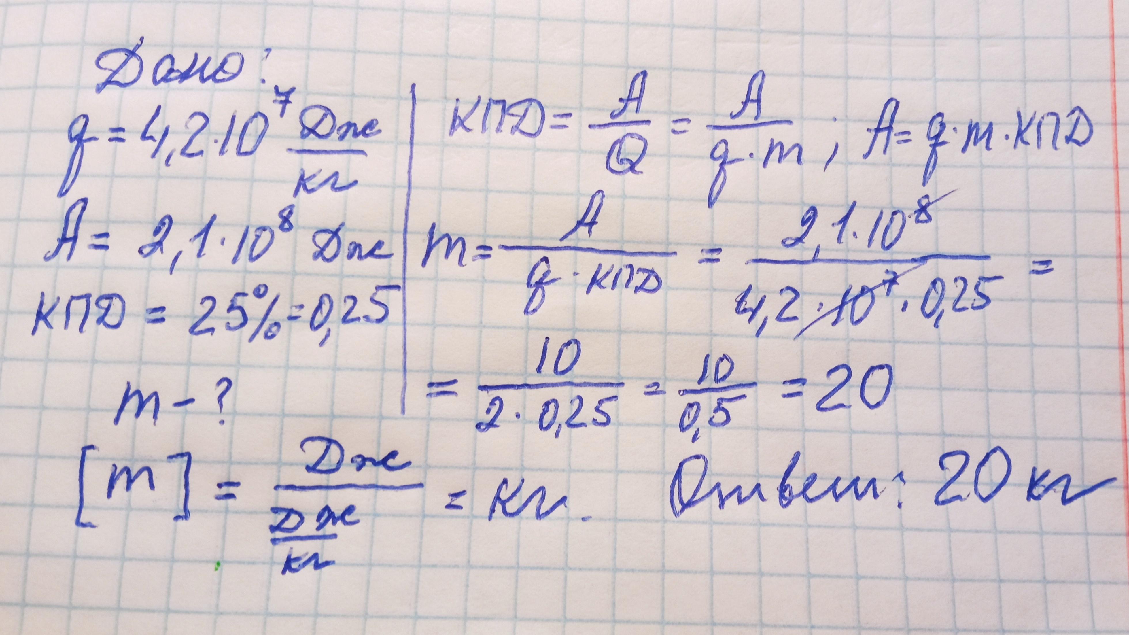 2) Двигатель работает на дизельном топливе, удельная теплота сгорания которого 4,2-10⁷Дж/кг.Определите массу топлива, расходуемого двигателем при совершении работы 2,1-10⁸ Дж, если КПД двигателя 25%. Дескриптор 1. записывает данные и вопрос задачи; 2.переводит единицы измерения в СИ; 3. использует формулу расчета КПД двигателя; 4. использует формулу расчета количества теплоты, выделившегося при сгорании топлива: 5. алгебраически выражает формулу расчета неизвестной величины; 6.правильно выполняет вычисления; 7.выполняет работу с единицами измерений; 8. записывает ответ задачи.