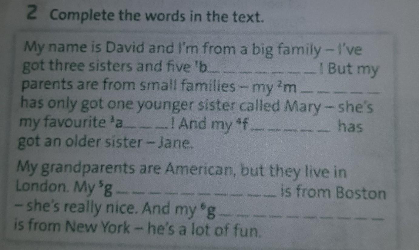my name is david and i am from a big family- I have got three sisters and five brothers! but my parents are from small families- my mother has only got yonger sister called mary- she is my favourite aunt! and me father has got an older sister- jane.