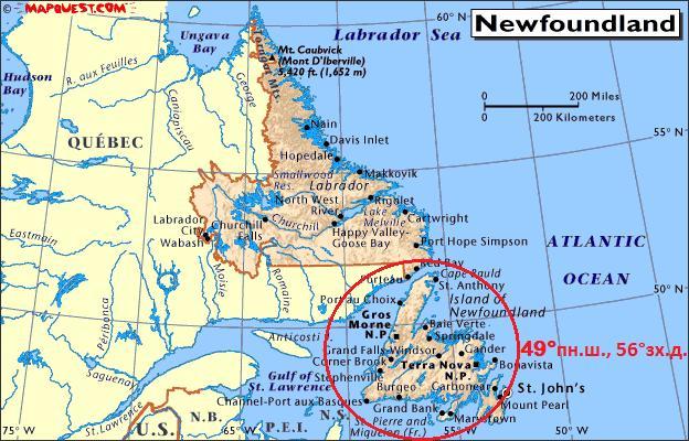 У 1912 р. через зіткнення з айсбергом затонув найбільший у світі пасажирський корабель «Титанік». Він вважався непотоплюваним, але пішов на дно з 1513 пасажирами на борту під час свого першого рейсу біля острова Ньюфаундленд, який має географічні координати 49опн.ш., 56озх.д.