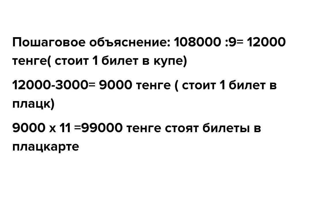 Решить по действиям и краткой записью на покупку 8 билетов купиный вагон для учеников путешествующих по казахстану потратили 108000 тенге сколько нужно заплатить за 14 билетов в группе путешествующих в плацкартонном вагоне если известно что 1 плацкартный билет на 3500 тенге дешевле купейного?