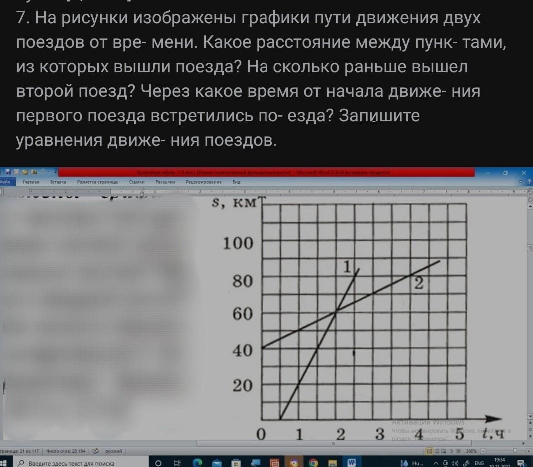 3) Поезда встретились через 2 часа после выезда первого поезда (видно из графика, точка пересечения прямых)