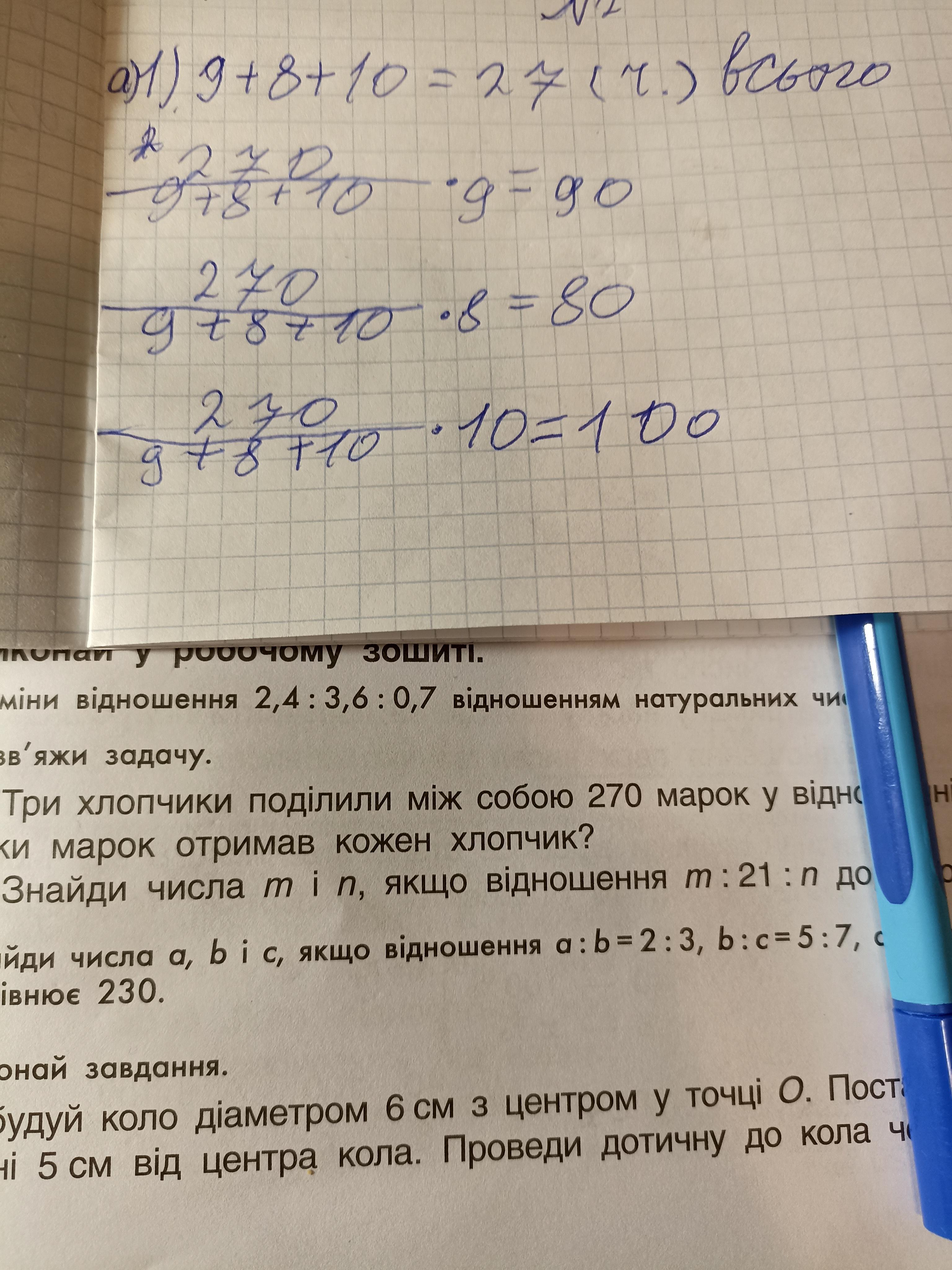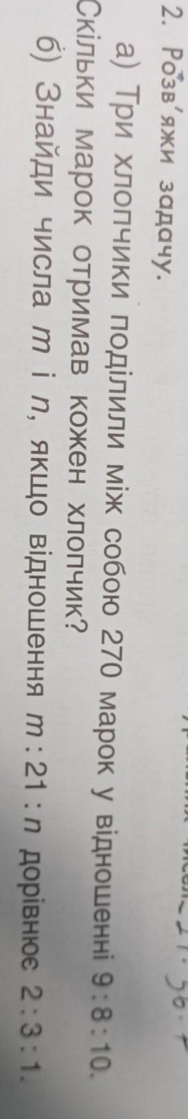 2. Розв'яжи задачу. a) Три хлопчики поділили між собою 270 марок у відношенні 9 : 8 : 10. Скільки марок отримав кожен хлопчик? б) Знайди числа m i n, якщо відношення m: 21 : n дорівнює 2 : 3 : 1.