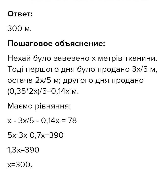 за перший день було продано 3/5 завезиной тканини за другий 35% остачі а за 3 решту 78 м скіліки метрів тканини було завезено в магазин?