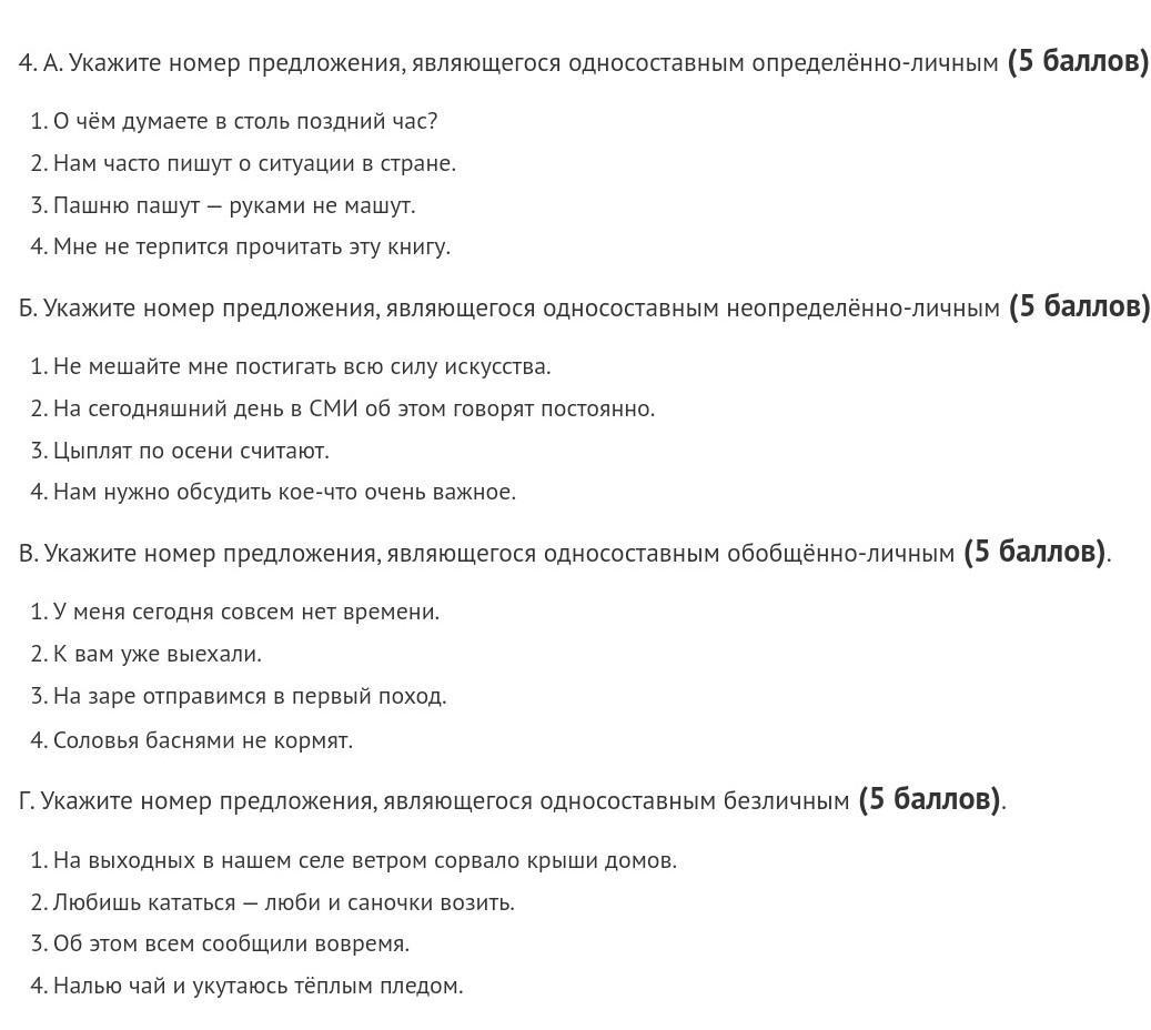 4. А. Укажите номер предложения, являющегося односоставным определённо-личным (5 баллов). 1. О чём думаете в столь поздний час? 2. Нам часто пишут о ситуации в стране. 3. Пашню пашут - руками не машут. 4. Мне не терпится прочитать эту книгу. Б. Укажите номер предложения, являющегося односоставным неопределённо-личным (5 баллов). 1. Не мешайте мне постигать всю силу искусства. 2. На сегодняшний день в СМИ об этом говорят постоянно. 3. Цыплят по осени считают. 4. Нам нужно обсудить кое-что очень важное. В. Укажите номер предложения, являющегося односоставным обобщённо-личным (5 баллов). 1. У меня сегодня совсем нет времени. 2. К вам уже выехали. 3. На заре отправимся в первый поход. 4. Соловья баснями не кормят. Г. Укажите номер предложения, являющегося односоставным безличным (5 баллов). 1. На выходных в нашем селе ветром сорвало крыши домов. 2. Любишь кататься - люби и саночки возить. 3. Об этом всем сообщили вовремя. 4. Налью чай и укутаюсь тёплым пледом.