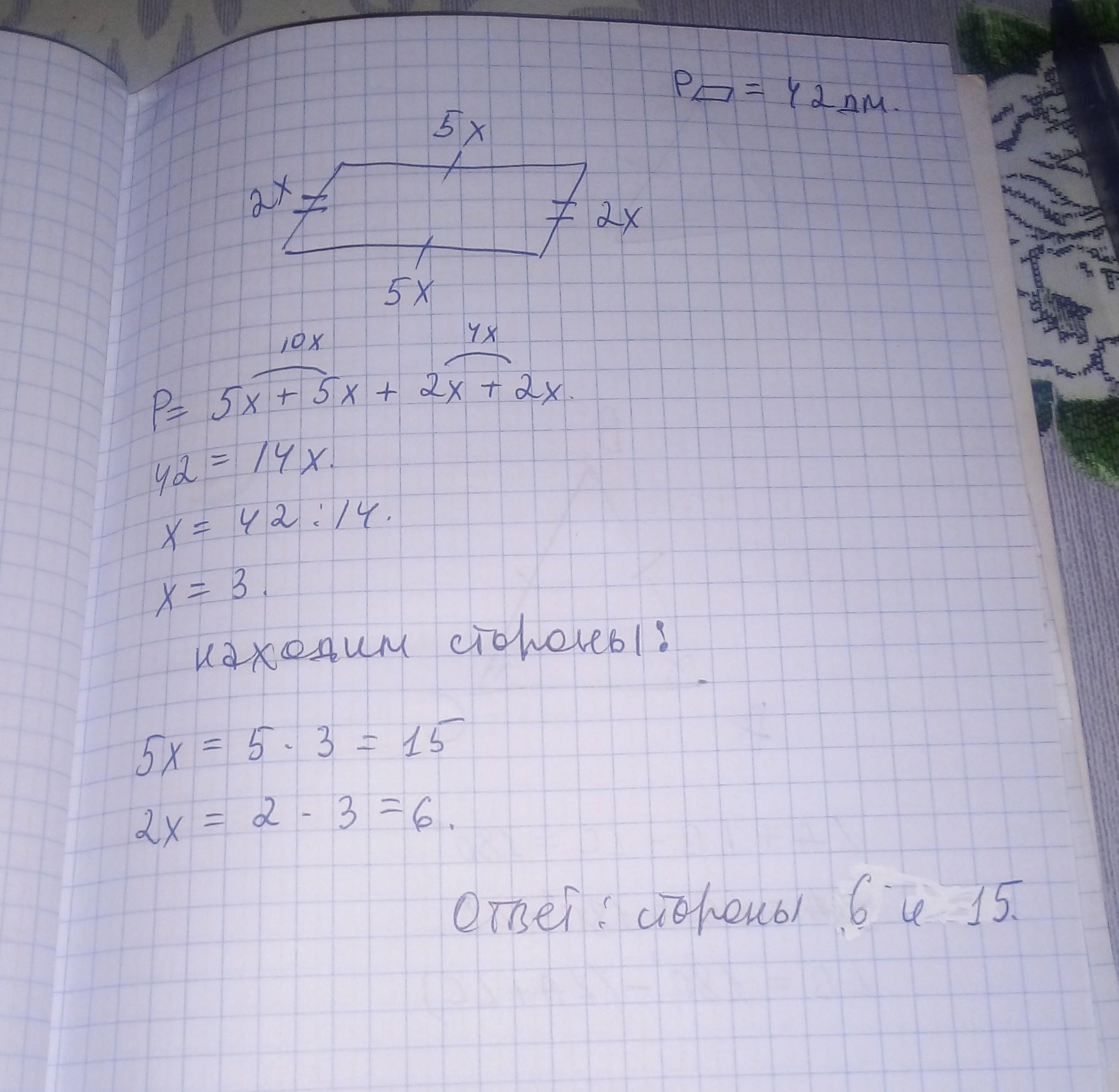 мы знаем что периметр это сумма всех сторон. в нашем случае стороны обозначены как 5х 5х 2х и 2х. то есть если все эти стороны сложить то получится периметр: