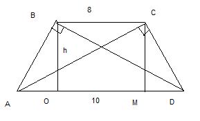 Найдите высоту равностороннего трапеции основы которой равны 10 см и 8 см а диагонали перпендикулярны к боковым сторонам