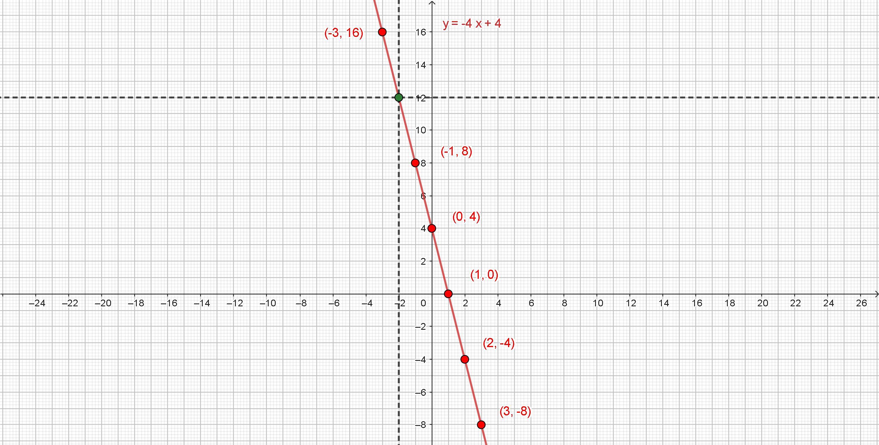 Теперь нужно найти значение х, при у = 12. Проводим вдоль у = 12 линию и смотрим где она пересечет линию функции у = -4х + 4. Отметим точку пересечения зеленым цветом. От этой точки опускаем линию к оси Ох и смотрим на значение. Оно равно -2.