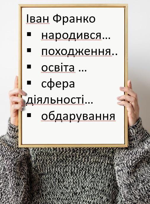 Відповідь: НАРОДИВСЯ: В селі "Нагуєвичі" ( нині Дрогобицького району Львівської області ). ПОХОДЖЕННЯ: присілку Війтова гора села Нагуєвичі Самбірського округу Королівства Галичини та Володимирії. ОСВІТА: поет, прозаїк, драматург, літератувний критик, публіцист, перекладач, науковець, громадський і політичний діяч, доктор філософії, член наукового товариства імені Шевченка, почесний доктор Харківського університету, член Всеукраїнського товариства " Просвіта". СФЕРА: поет. ОБДАРУВАННЯ: Франко обдарував нашу літературу найщирішими перлами свого життя.