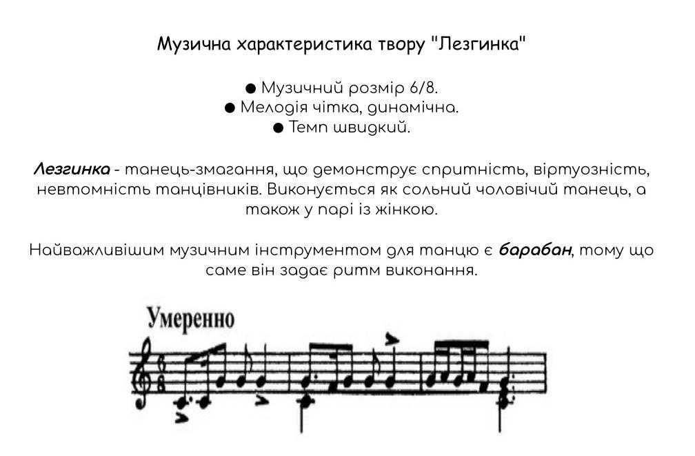 Музыкальная характеристика произведения "Лезгинка" представлена на фотографии.