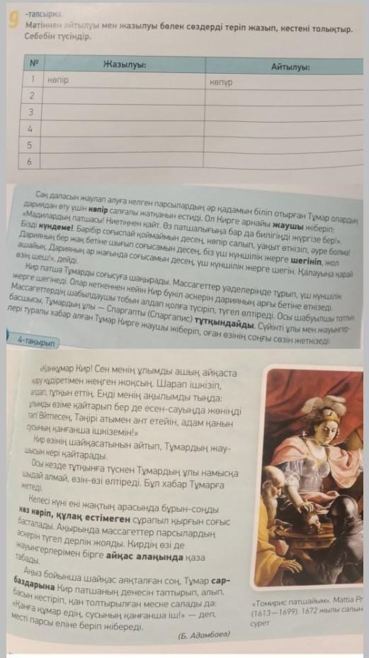 ЖАЗЫЛЫМ 9 -тапсырма. Мәтіннен айтылуы мен жазылуы бөлек сөздерді теріп жазып, кестені толықтыр. Себебін түсіндір. No 1 2 3 4 5 6 кепір Жазылуы: көпүр Айтылуы