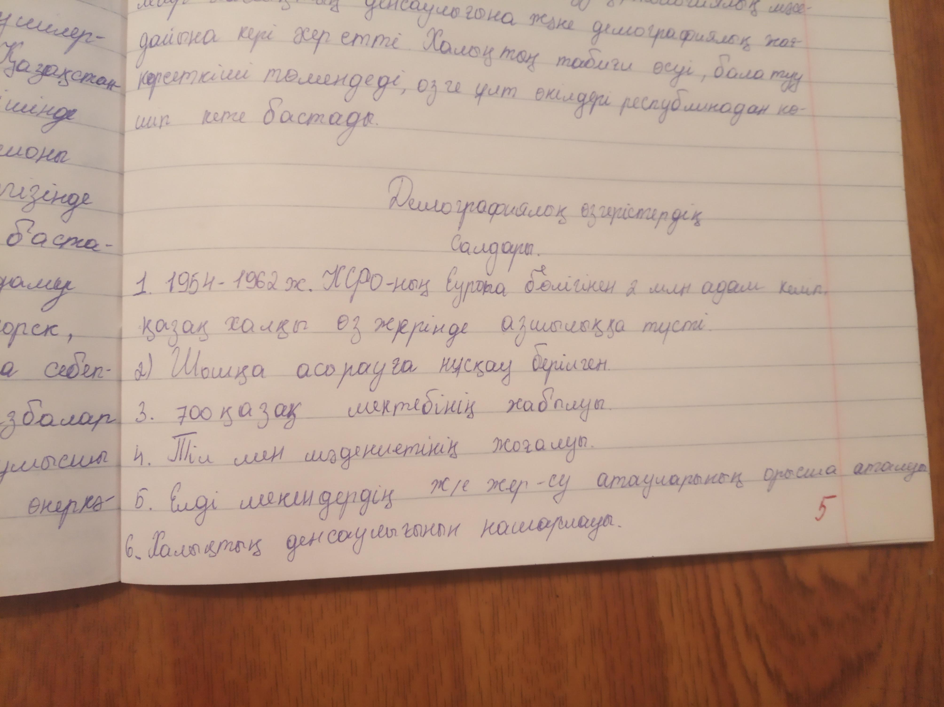 2-тапсырма. Мәтінмен жұмыс жасап, тың игеру салдарынан кандай демо- графиялық өзгерістер болғанын аныктандар. Ойталқы Қазақ халқының өз жерінде азшылыкка душар болуы, қорытынды жасауға болады? 1954-1962 жылдары тың игеруге КСРО-ның еуропалық бөлігінен 2 млн адам келді. Сол себепті казак халкы өз жерінде азшылық жағдайына түсті. Осы кезеңде кеңестік әкімшіл-әміршіл бул дерек арқылы қандай басқару жүйесінің кемістіктері айқын байқалды. Казакстанның әлеуметтік-демографиялык муд- делерi мен ұлттық ерекшелiктерi ескерiлмедi. Қоршаған орта мен халық- тын денсаулығын қорғау өткір мәселеге айналды. Тың игерілген облыс- тарда 700 қазақ мектебі жабылды. Бул, бiрiншiден, казак жастарының ұлттык тiлi мен медениетiнен кол узуіне әкеп соктырды. Екіншіден, Казак елінін елдi мекендері мен жер-су атаулары орысша атала бастады. Акмола каласы Целиноград деп өзгертiлдi. Тың игеру кезінде құрылған совхоздарда жергілікті халықтың ерекшеліктері ескерілмей, кейбiр казак ауылдарына да шошқа есіруге нұсқау берілді. Шошқа шаруашылығын дамыту мен жайылымдардын кыскаруы казак халқының дәстүрлі мал- шаруашылығына кері әсерін тигізді.