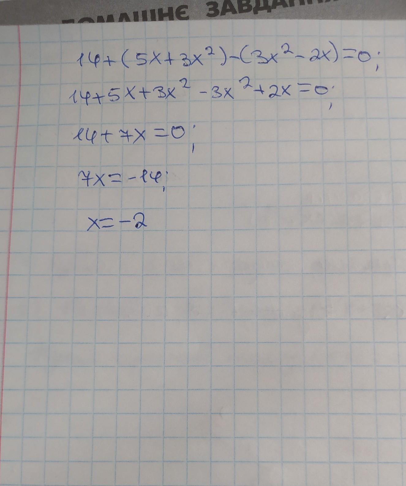 14+(5x+3x²)-(3x²-2x)=0