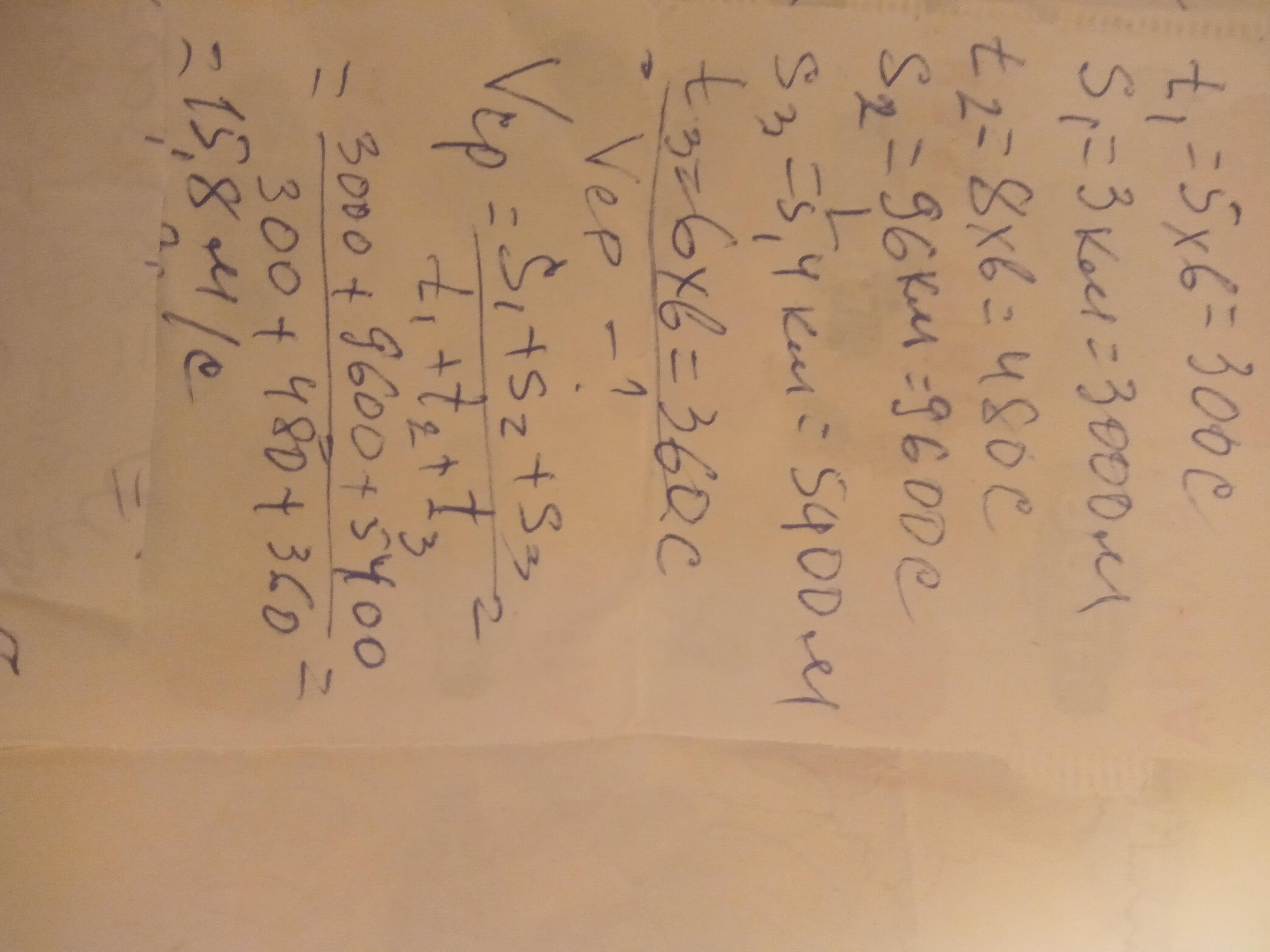 Якою є середня швидкість руху велосипедиста (в СІ), якщо за перші 5 хв він проїхав 3 км, потім за 8 хв – 9.6 км і за останні 6 хв –5.4 км?