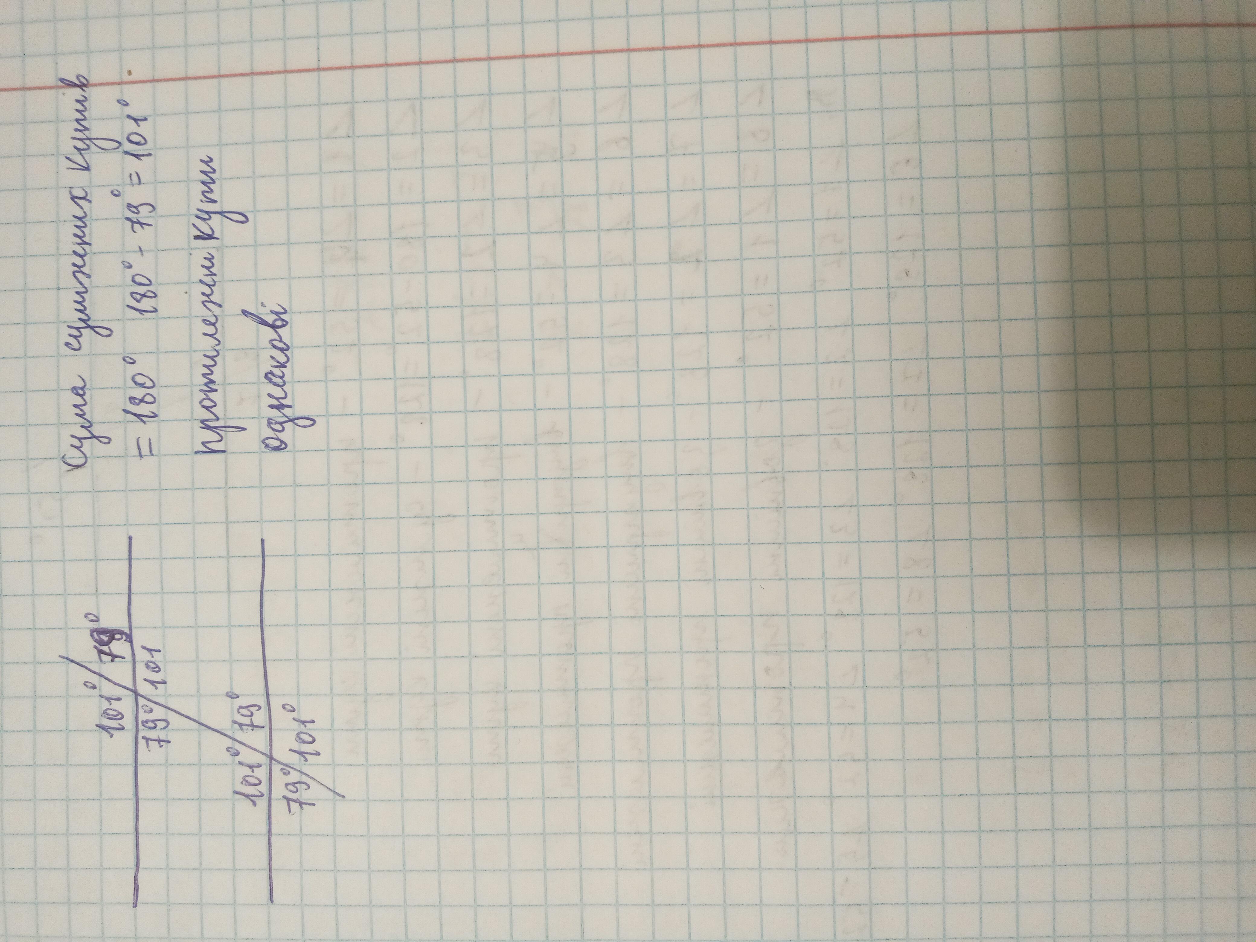 Дві паралельні прямі перетинаються третьою, один з утворених кутів 79°. Знайти градусні міри всіх утворених кутів.(даю 100б)