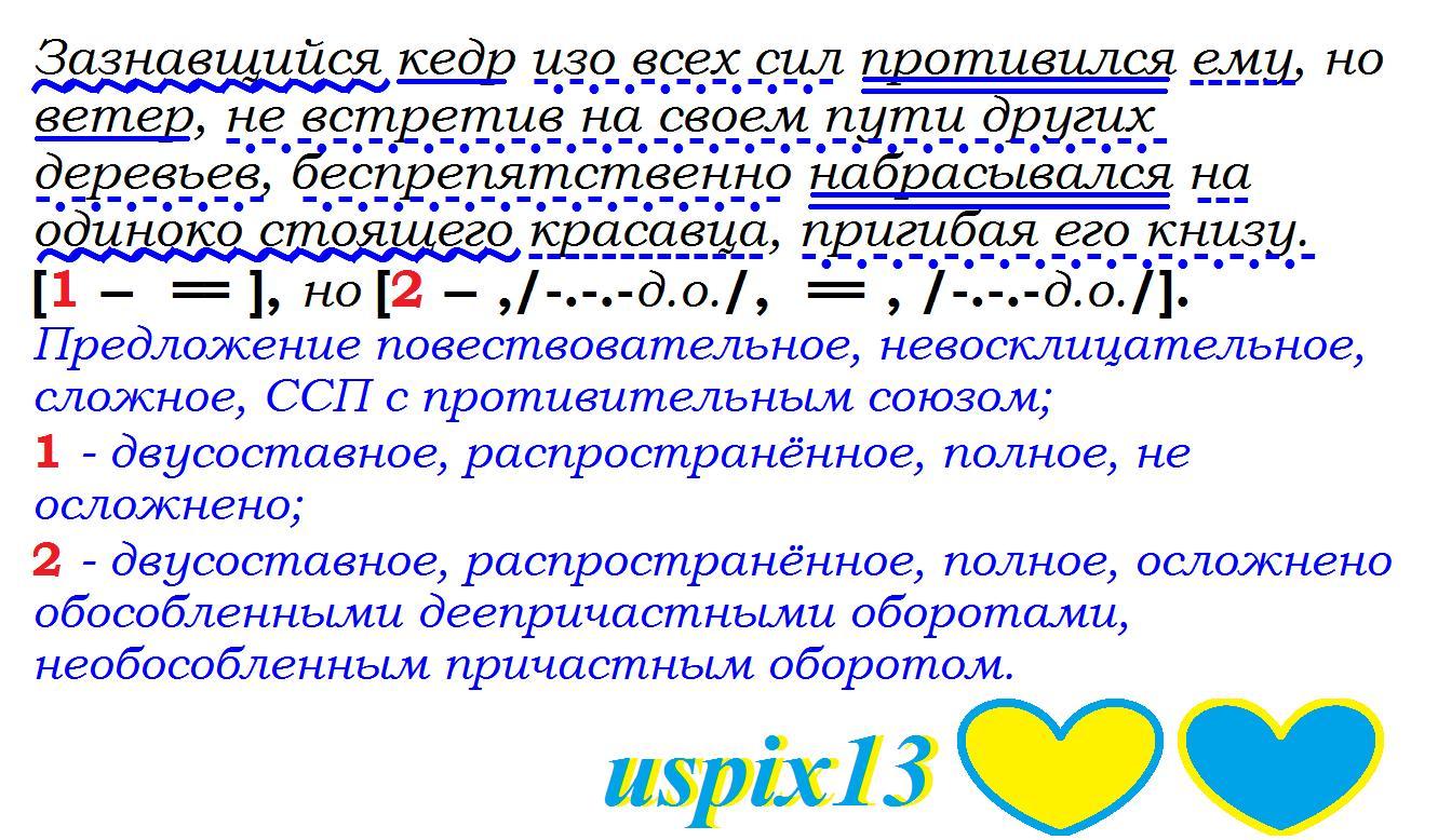 Зазнавщийся кедр изо всех сил противился ему,но ветер,не встретив на своем пути других деревьев, беспрепятственно набрасывался на одиноко стоящего красавца,пригибая его книзу.