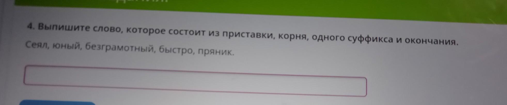 4. Выпишите слово, которое состоит из приставки, корня, одного суффикса и окончания. Сеял, юный, безграмотный, быстро, пряник.