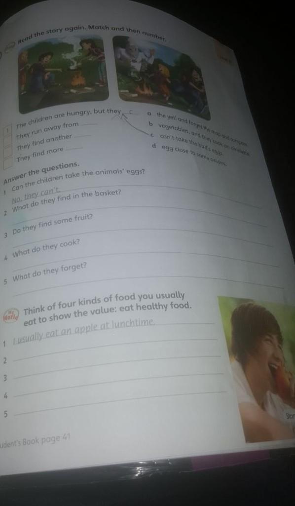 The children are hungry, but they c They run away from They find another They find more Answer the questions. 1 Can the children take the animals' eggs? No, they can't 2 What do they find in the basket? 3 Do they find some fruit? 4 What do they cook? 5 What do they forget? 2 3 Read the story again. Match and then number. Think of four kinds of food you usually eat to show the value: eat healthy food. 1 Lusually eat an apple at lunchtime. My 5 41 www a the yeti and forget the map and compon b vegetables, and they cook on one c can't take the bird's eggs d egg close to some onions