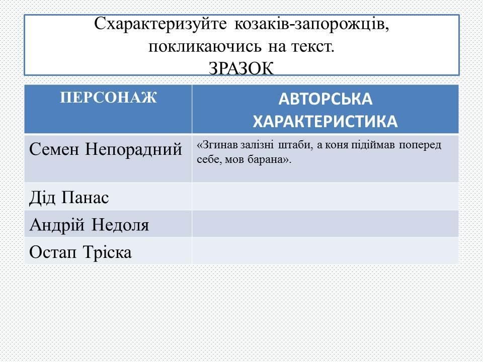 Дід Панас. (Обирайте щось одне або й все перепишіть) "Правда, що не годен був шаблею гаразд вимахувати, зате стріляв з рушниці так, що птиці на лету не хибив. До того він знав лікувати рани зіллям і через те радо його приймали до гурту. Його знала вся Україна як характерника, цебто, такого, що його куля не береться".