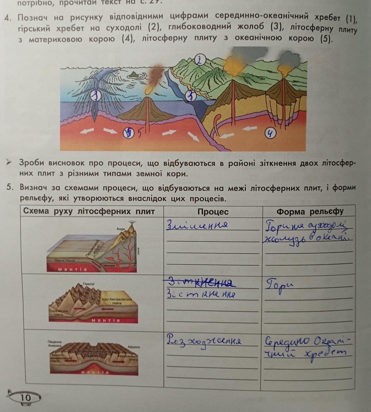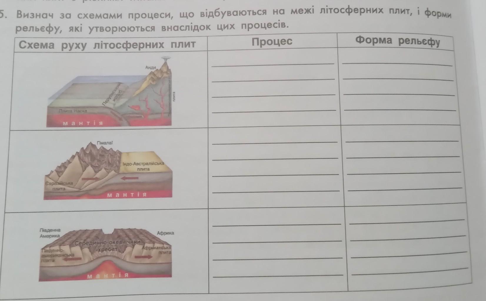 5. Визнач за схемами процеси, що відбуваються на межі літосферних плит, і форми рельєфу, які утворюються внаслідок цих процесів.