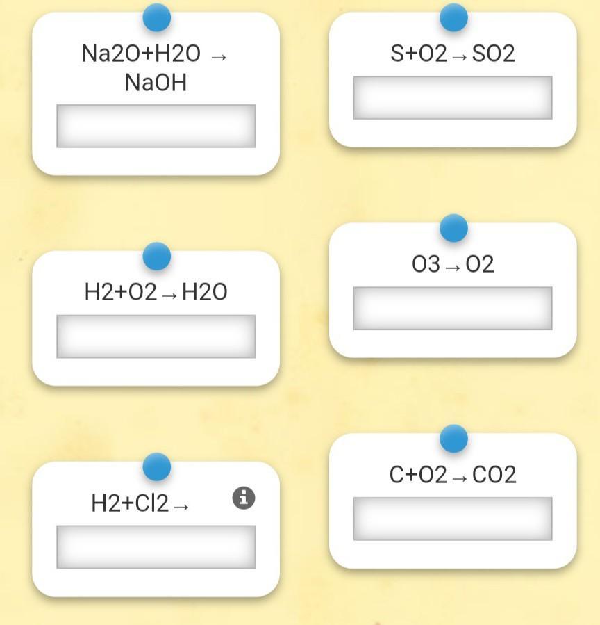 2H2 + O2 —> 2H2O; 2O3–>3O2; H2 + Cl2 —> 2HCl; C + O2 —> CO2