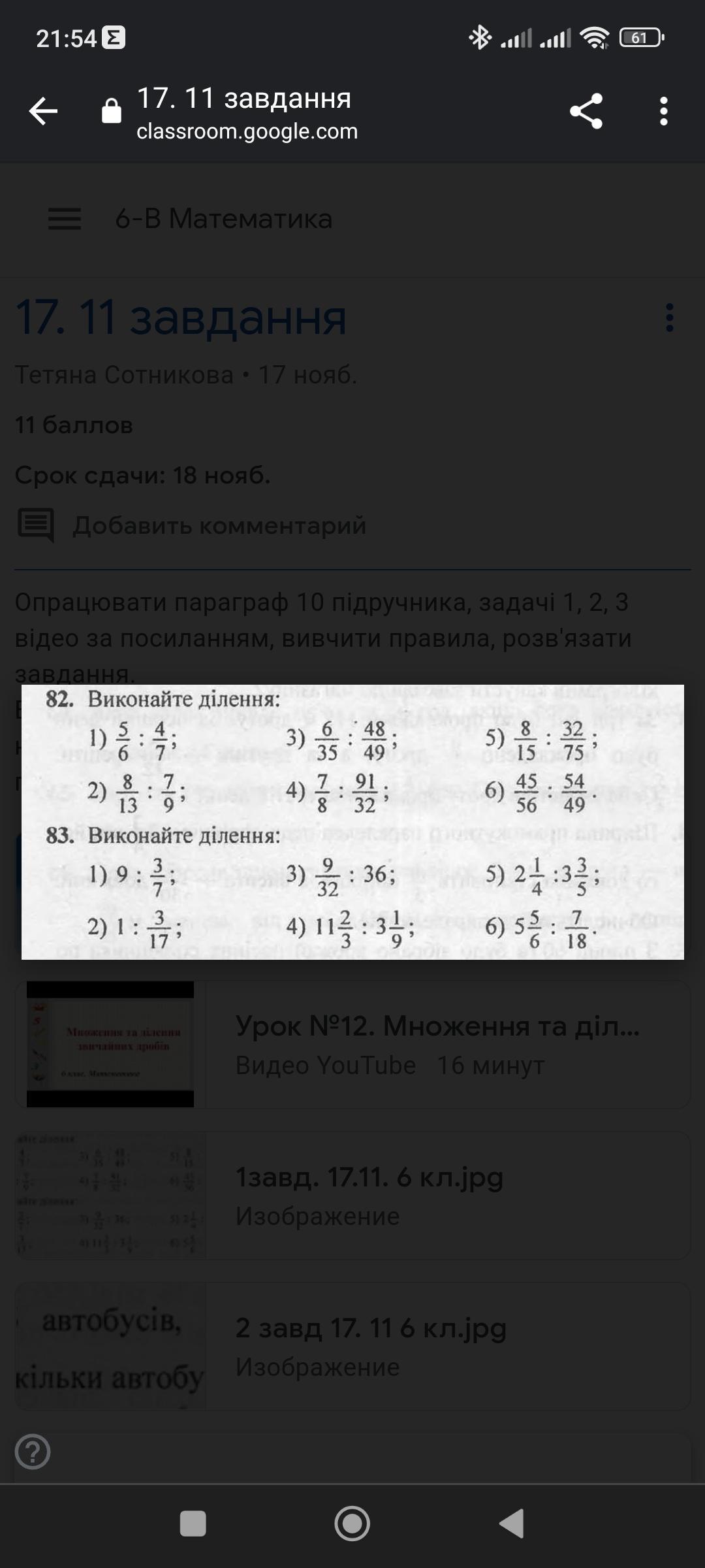 82. 1) 35/24; 2)72/91; 3) 7/40; 4) 4/13; 5) 5/4; 6) 35/48.(для того щоб виконати ділення, потрібно помножити на обернений дріб).
