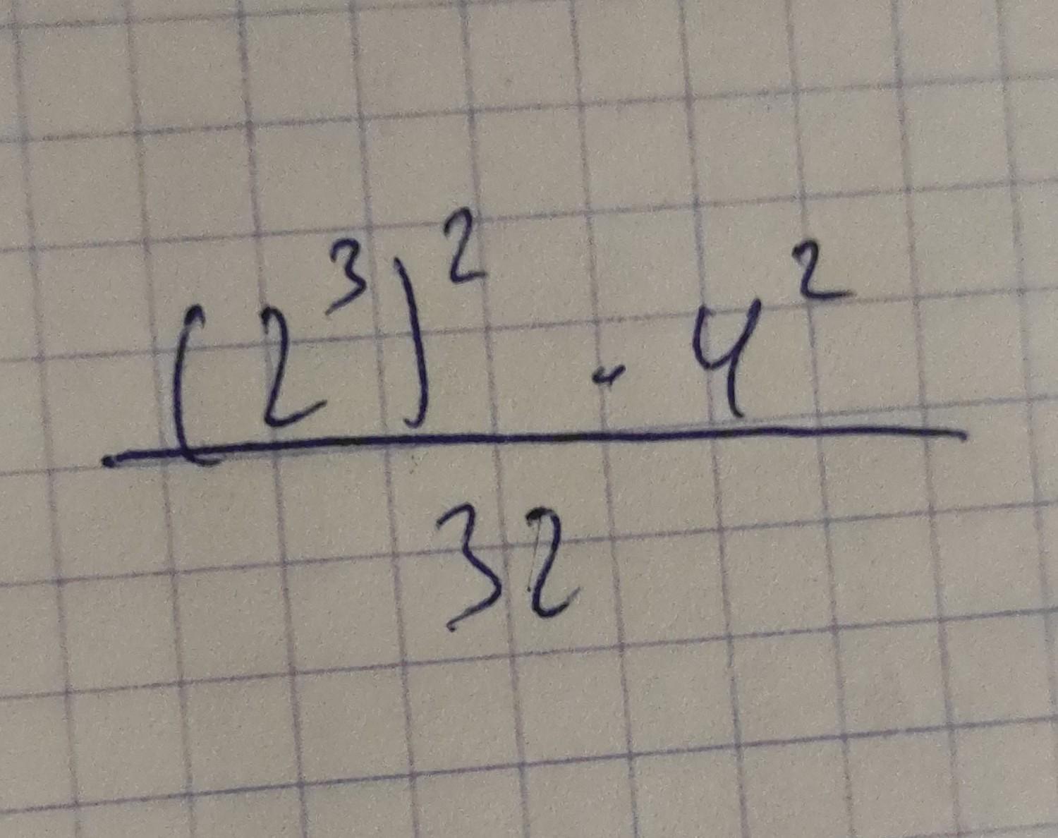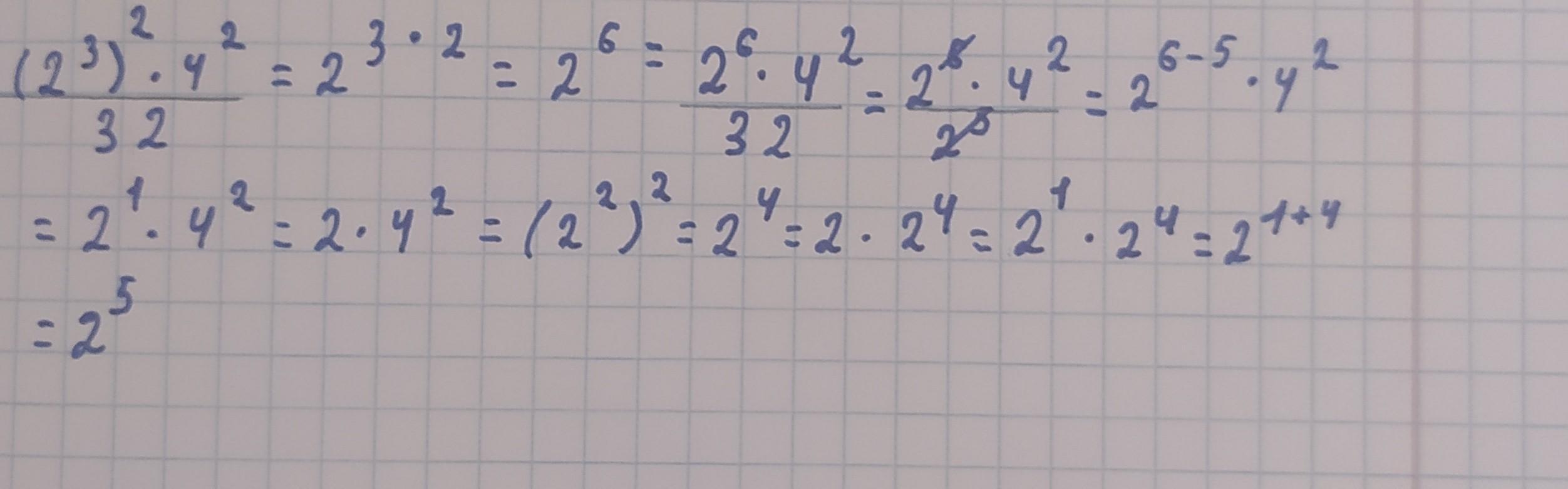 (2^3)^2 * 4^2/32 = 8^2 * 4^2/32 = 64*16/32 (64 и 32 сокращается на 2) = 32/32 = 1. Надеюсь правильно