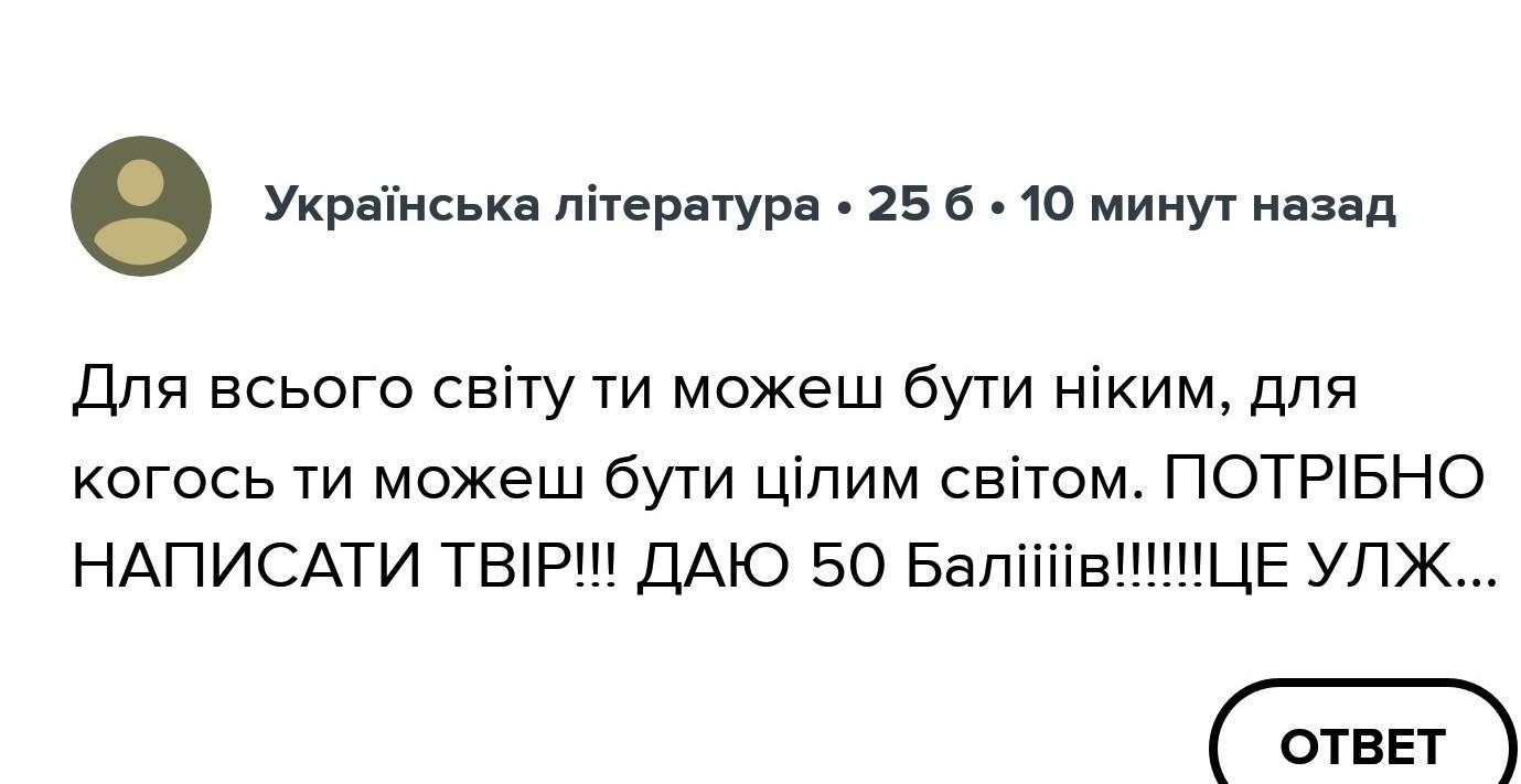 Для всього світу ти можеш бути ніким, для когось ти можеш бути цілим світом. ПОТРІБНО НАПИСАТИ ТВІР!!! ДАЮ 50 Баліііів!!!!!!ЦЕ УЛЖЕ СРОЧНО ПОТРІБНО ДО ЗАВТРА