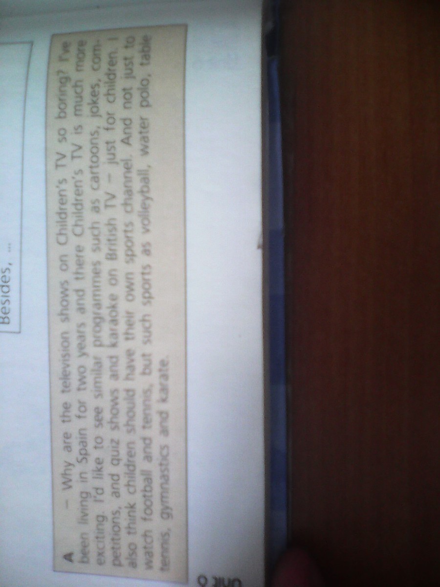 Почему телевизионные шоу на Детском телевидении такие скучные? Я жил в Испании и детские шоу там гораздо интереснее. Я бы хотел видеть похожие программы, такие как мультики, шутки, конкурсы и викторины и караоке на Британском телевидении -только для детей. Я также думаю, что у детей должен быть свой спортивный канал. И не только, чтобы просто смотреть футбол и теннис, но и такие виды спорта, как волейбол, водное поло, настольный теннис, гимнастика и карате.