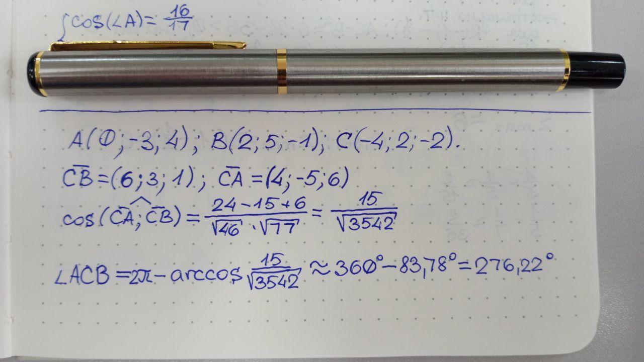A(O,-3,4), B(2,5,-1), С(-4,2,-2). Знайти зовнішній кут при вершині С.