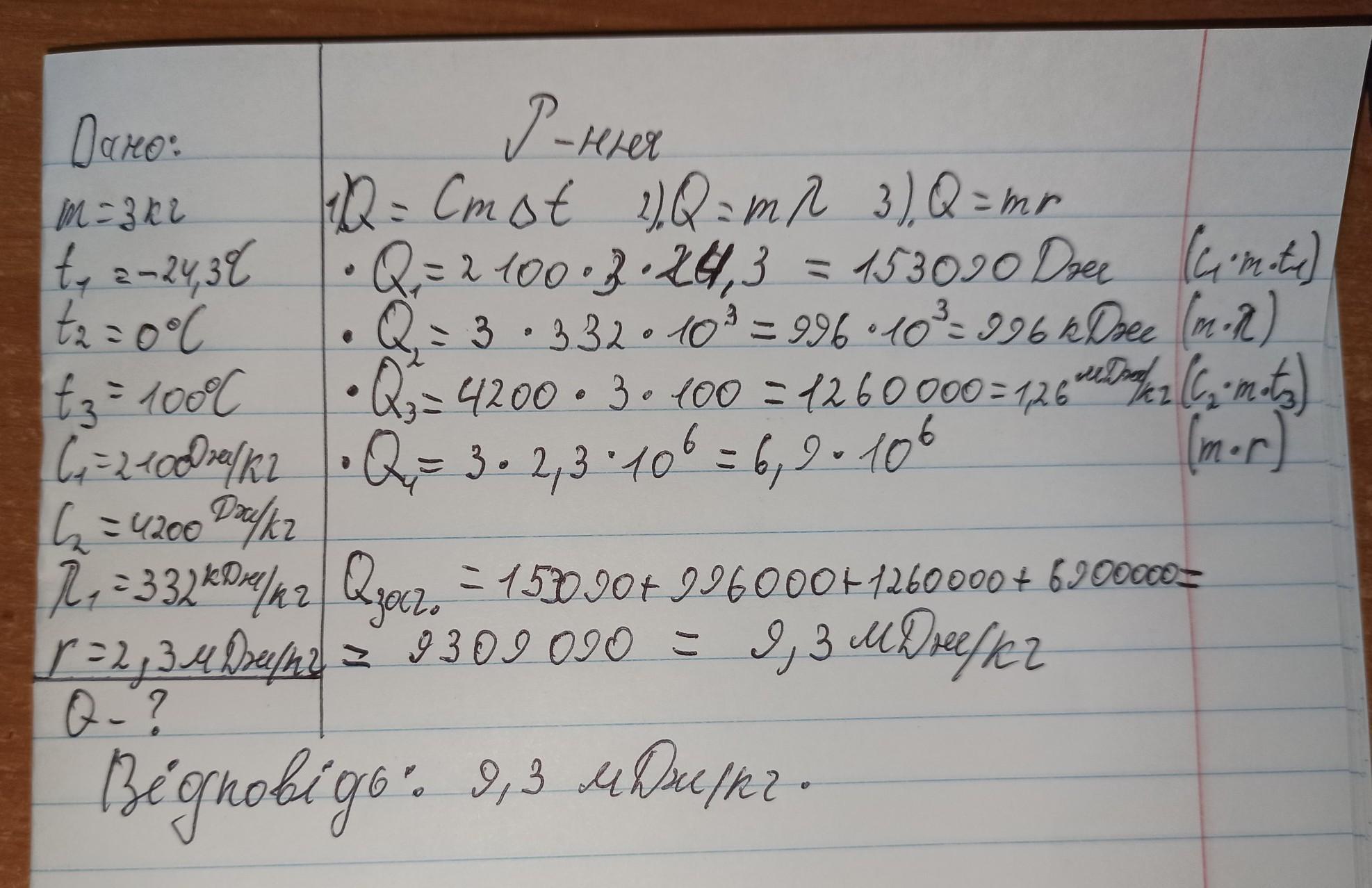Яка кількість теплоти необхідна, щоб із льоду масою 3кг при температурі -24,3°С одержати пару з температурою 100°С? Питома теплоємність льоду с = 2100Дж/(кг • °С), питома теплоємність води 4200Дж/(кг • °C), питома теплота плавлення льоду λ=332кДж/кг=332000Дж/кг,питома теплота випаровування води r = 2,3МДж/кг = 2300000Дж/кг. Відповідь заокругли до десятих