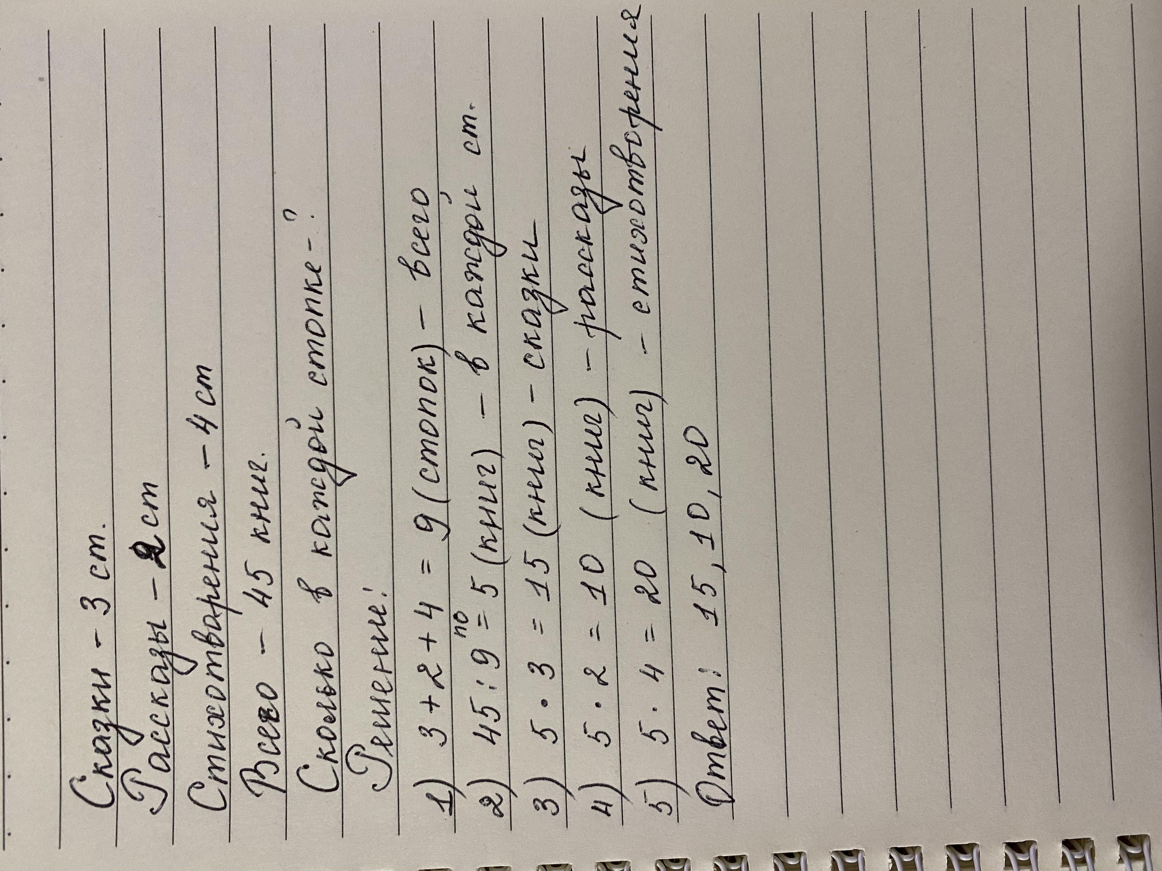 Реши задачу. Запиши ответ. В библиотеке 45 книг разделили на стопки по одинаковому количеству книг в каждой стопке. Получилось 3 стопки книг со сказками, 2 стопки книг с рассказами и 4 стопки книг – сборники стихотворений. Сколько всего книг со сказками? С рассказами? Со сборниками стихотворений? Сказки - Рассказы - Сборники стихотворений - книг. книг. & Проверить книг.