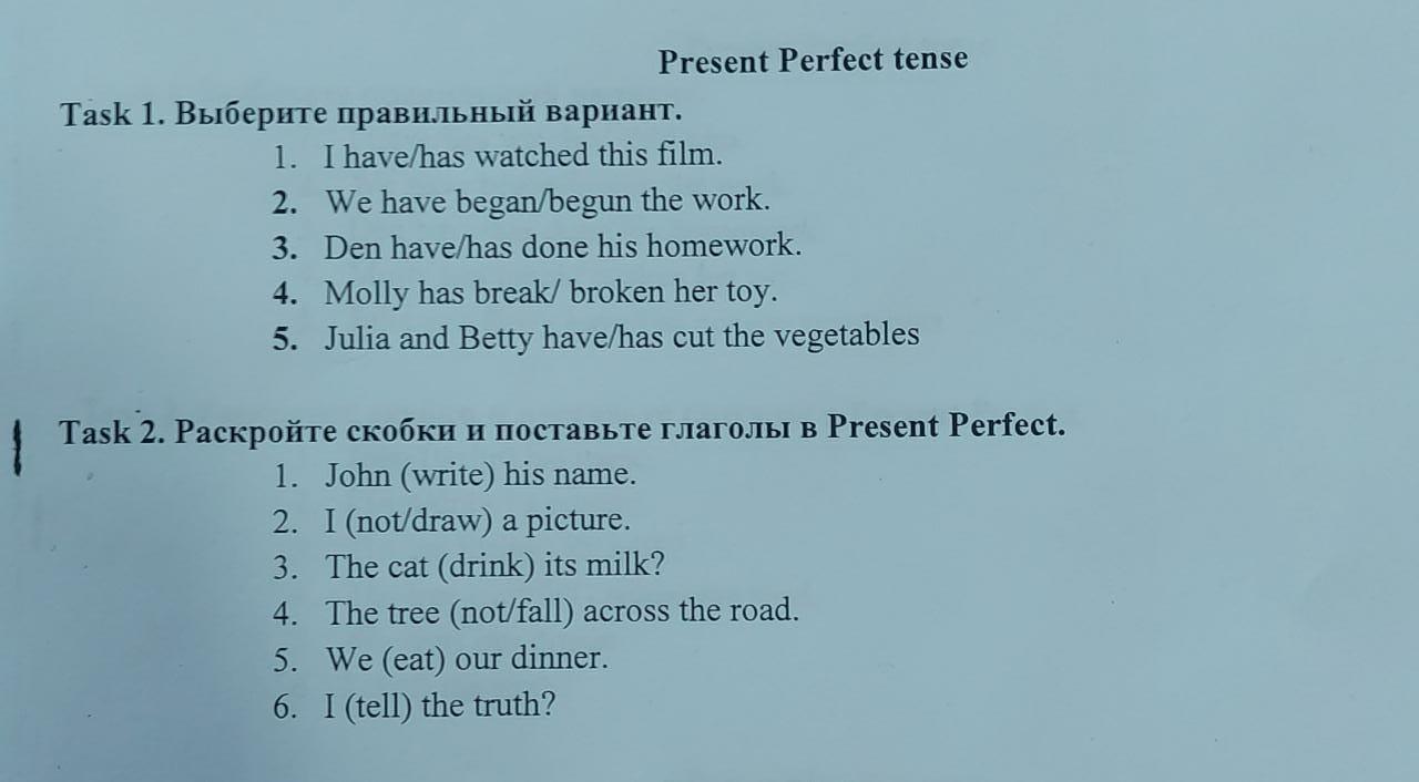 1 have 2 begun 3 has 4 broken 5 has 2 task 1 writing 2 not drawing 3 drinking 4 falling 5 eating 6 telling