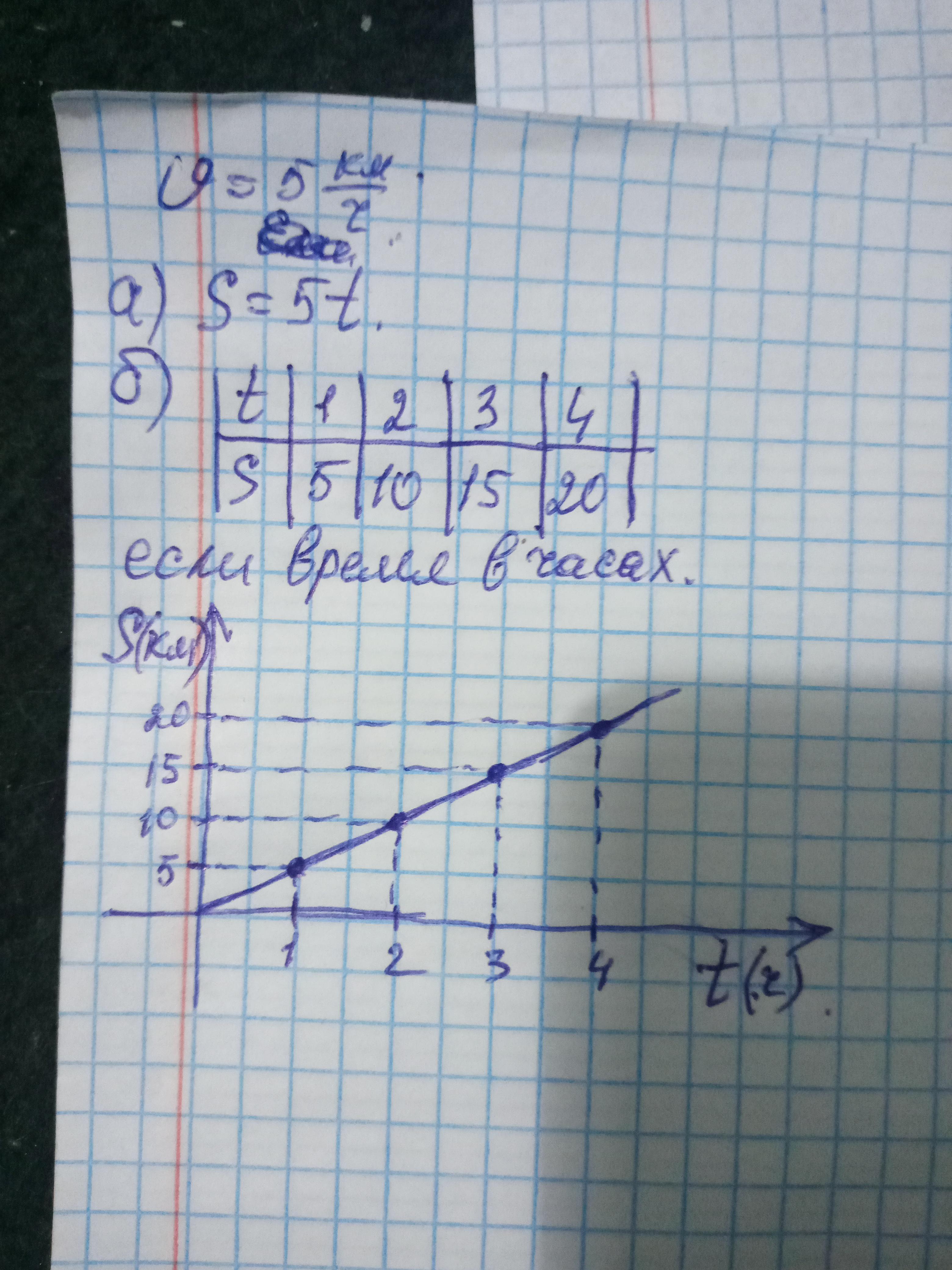 Объект движется с постоянной скоростью 5 км/ч а) напишите формулу зависимости пройденного пути (S) от затраченного времени (t) б) составьте таблицу значений S при t= 1,2 ,3,4 с) построить на основе этих значений график,