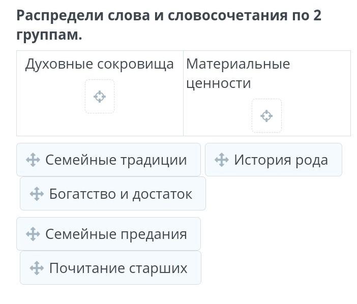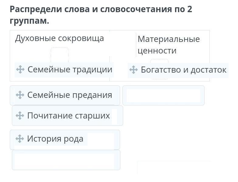 Распредели слова и словосочетания по 2 группам. Духовные сокровища Материальные ценности Семейные традиции Богатство и достаток Семейные предания Почитание старших История рода